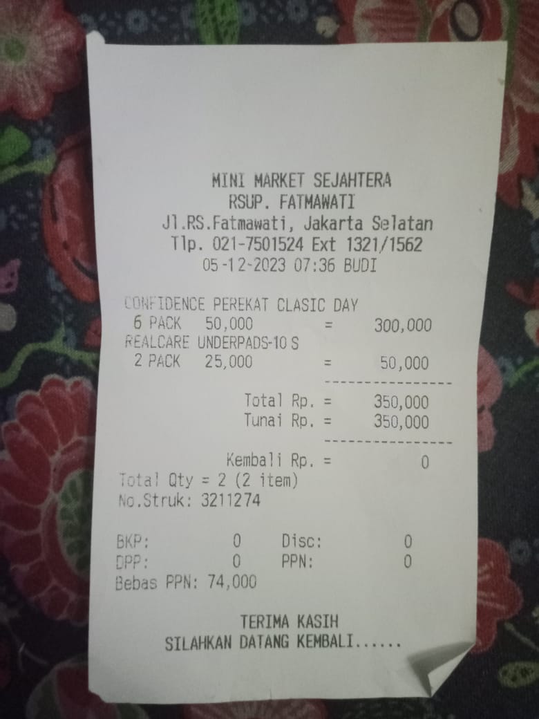 Dana digunakan untuk 1. Diapers Confidence classic day perekat L7 50.000 x 6 pcs= Rp300.000 2. Underpad 25.000 x 2 pcs= Rp50.000.2023-12-04 17:42:45