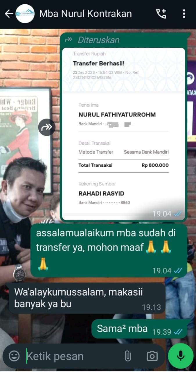 Dana digunakan untuk 1. Biaya pembayaran sewa kontrakan bulan Desember 2023 Rp800.000 2. Biaya listrik bulan Desember 2023 Rp180.000 3. Diapers confidence classic day perekat L7 50.000 x 6 pcs= Rp300.000 4. Underpad 25.000 x 4 pcs= Rp100.000 5. Biaya transportasi grabcar pulang-pergi dari rumah ke RS Fatmawati untuk proses kemoterapi ke-3 Rp130.000.2023-12-22 18:14:50