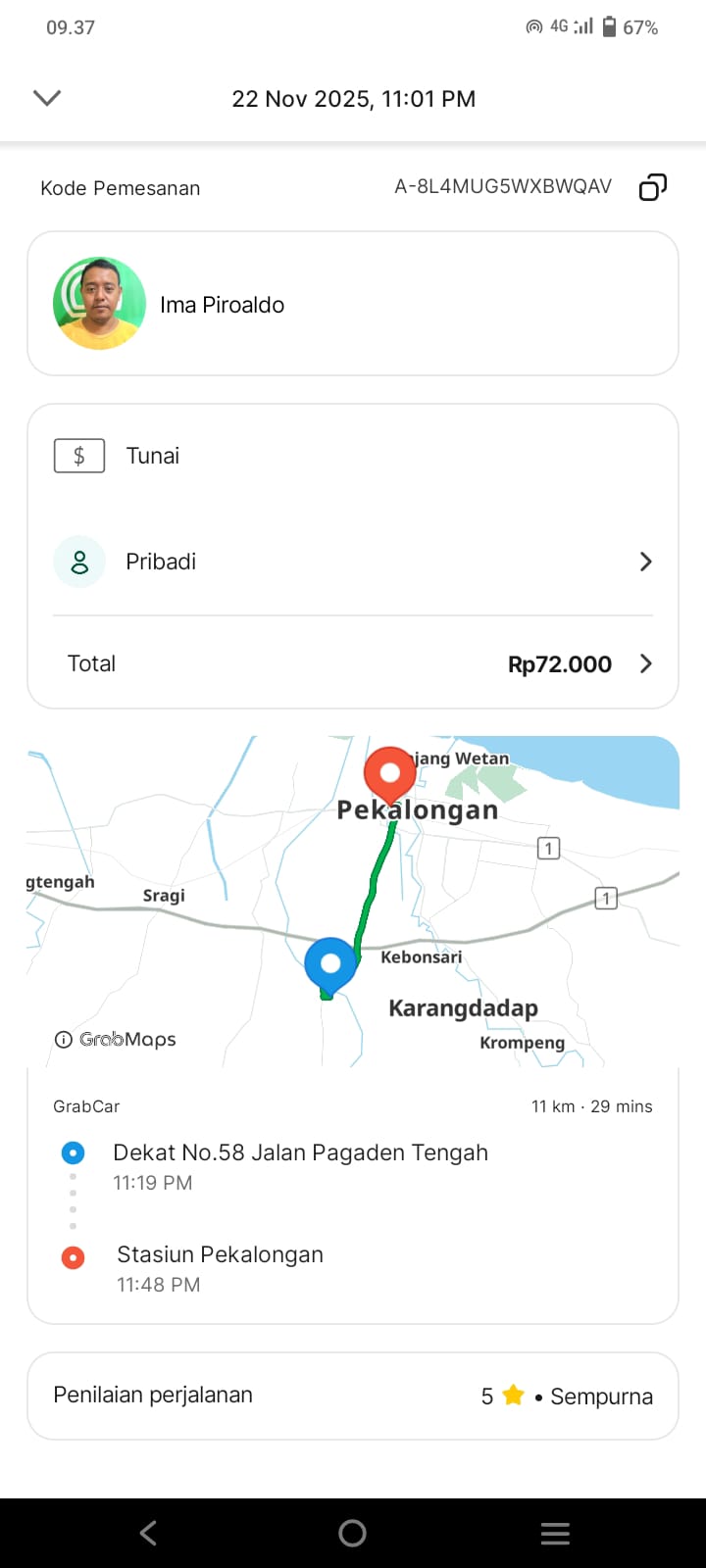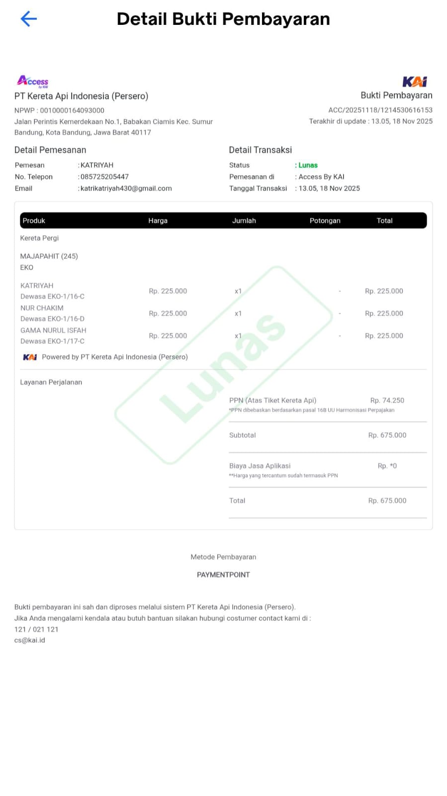 Dana digunakan untuk 1. Naik Grab dari rumah ke stasiun Rp70.000 2. Reimburse Naik kereta 3 orang xRp225.000= Rp675.000 3. Naik Grab dari stasiun senin kerumah singgah aafiyah Rp70. 000 4. Konsumsi di Jakarta 15 hari Rp1.500.0002025-11-21 10:01:51