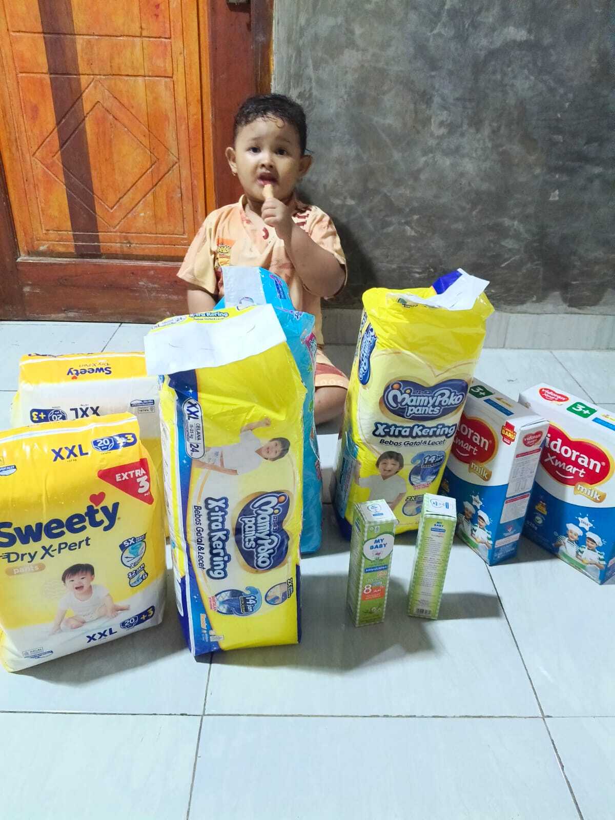 Dana bantuan dari #TemanBaik digunakan untuk pembelian pampers, minyak telon, dan susu.