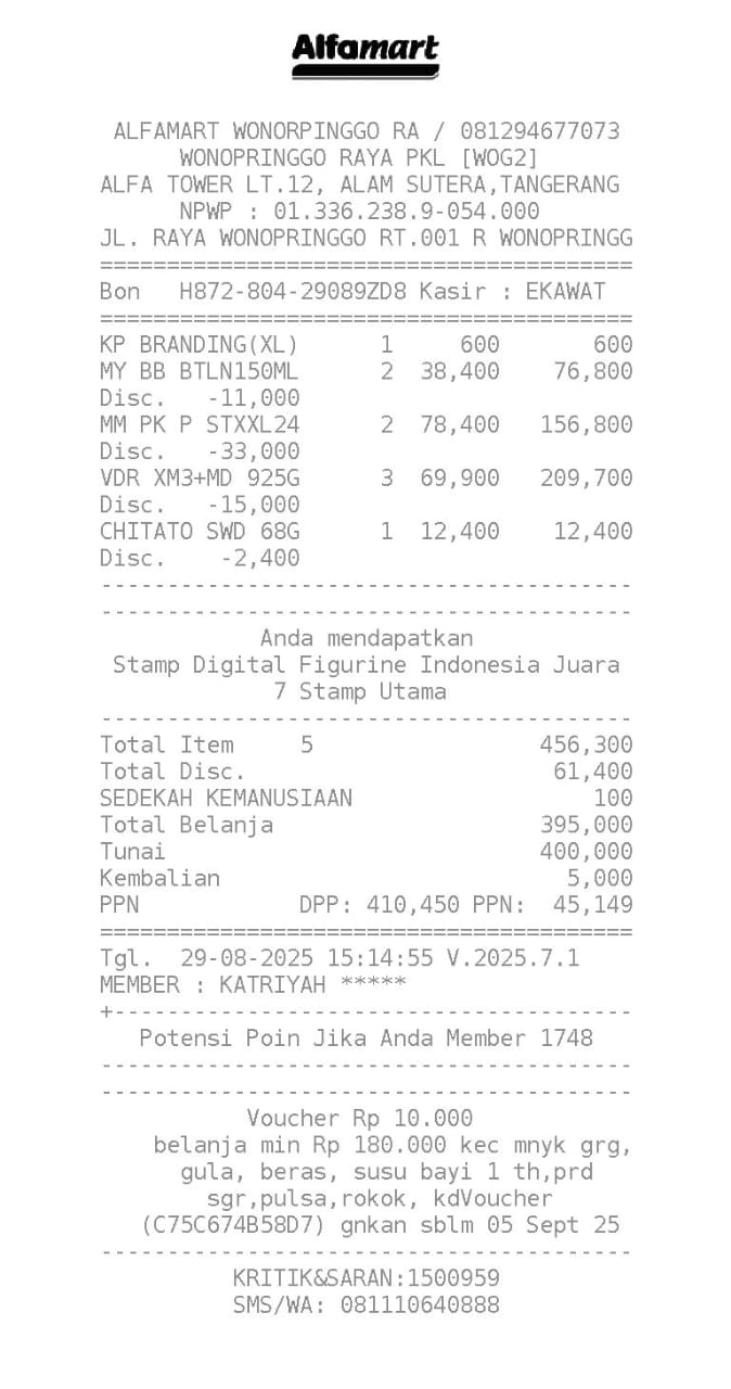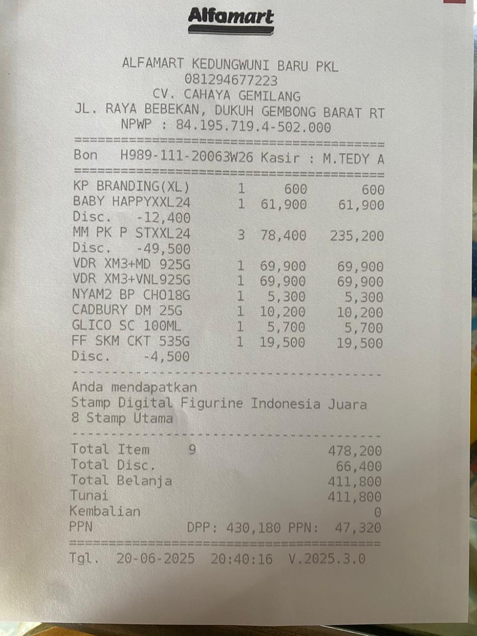 Dana digunakan untuk 1.Pampers mamy poko ukuran xxl Rp70.000x 4 ball= Rp280.000 2. Susu vidoran 3+ 925 mg Rp70.000 x 2 dus= Rp140.0002025-06-23 10:02:05
