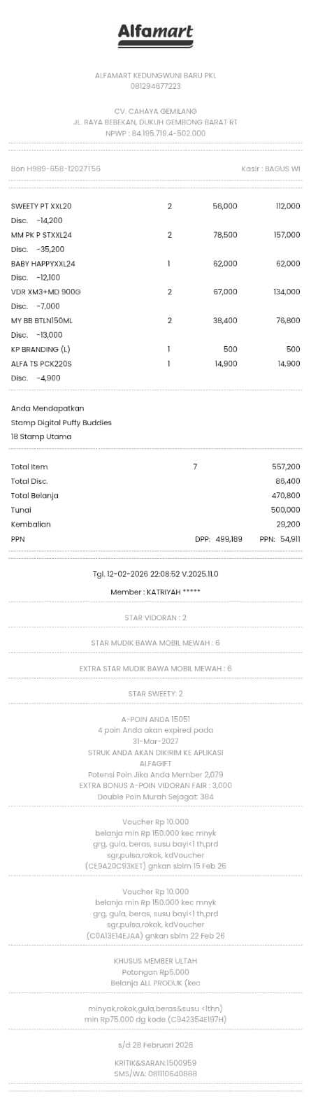 Dana digunakan untuk 1. Pampers mamy poko xx Rpl70.000 × 5ball= Rp350.000 2. Minyak telon 150ml Rp40.000×2= Rp80.000 3. Susu vidoran 925gram 3+ Rp70.000× 2= Rp140.0002026-02-10 17:11:06