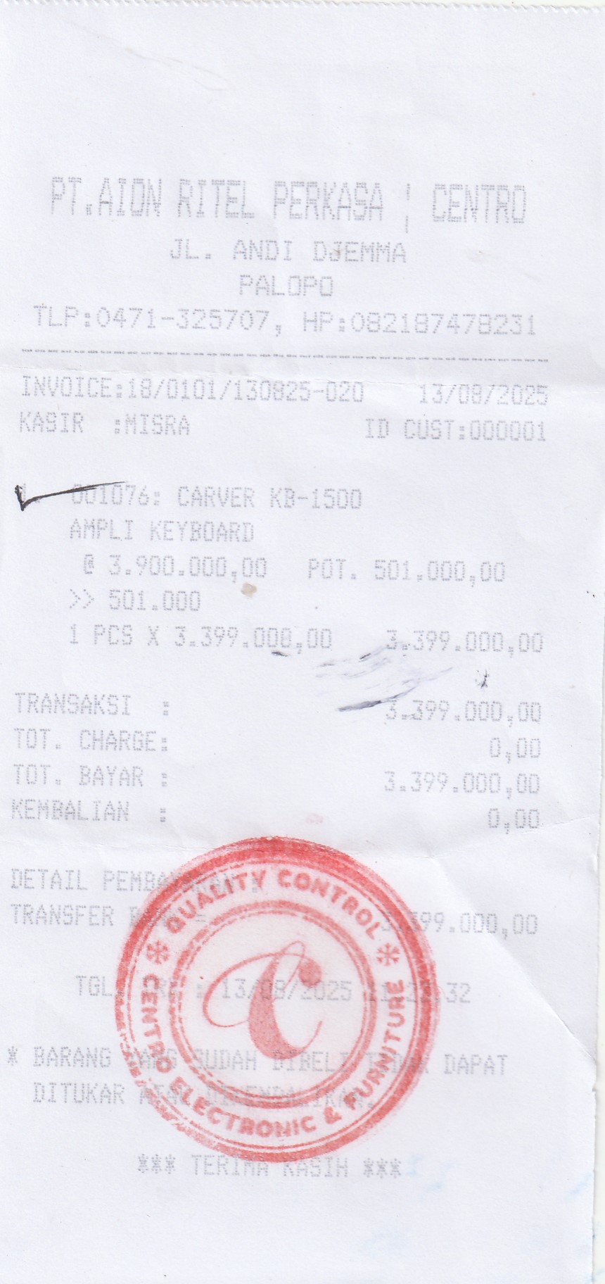 Pada 13 Agustus 2025, dilakukan pembelian 1 unit Keyboard Amplifier merek Carver tipe KB/A 1500 seharga Rp3.399.000.