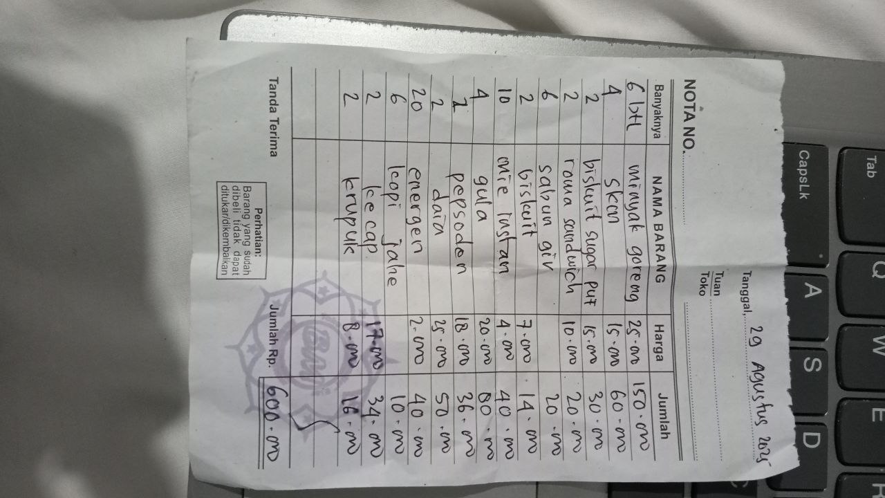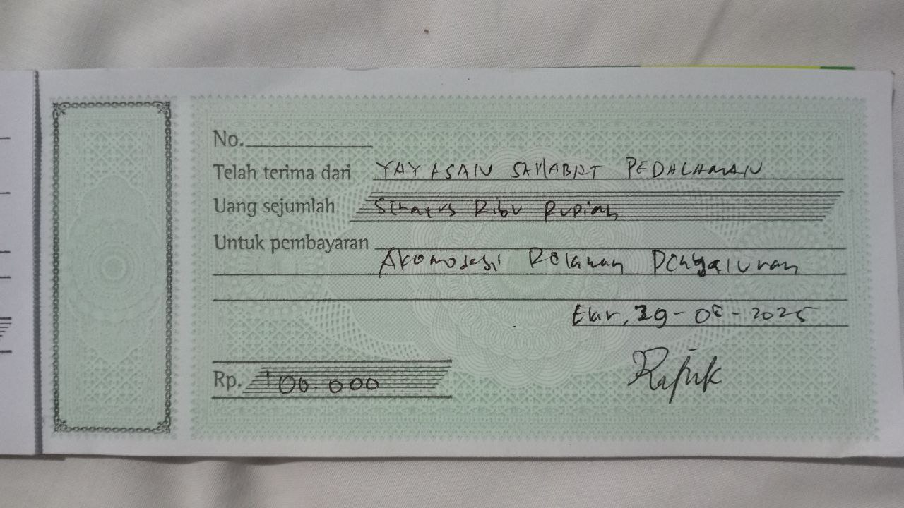 Dana digunakan untuk 1 Beras 5 Kg 2 Karung Rp 220.000 2 Minyak Goreng 2 liter 2 PcsRp 130.000 3 Gula Pasir 2 Kg Rp 50.000 4 Garam & Penyedap 2 Pack Rp 30.000 5 Mie Instan 2 PackRp 70.000 6 Telur 2 Kg Rp 65.000 7 Sarden 2 Kaleng Rp 70.000 8. Akomodasi / ongkos kirim penyaluran barang Rp150.0002025-08-28 09:28:53
