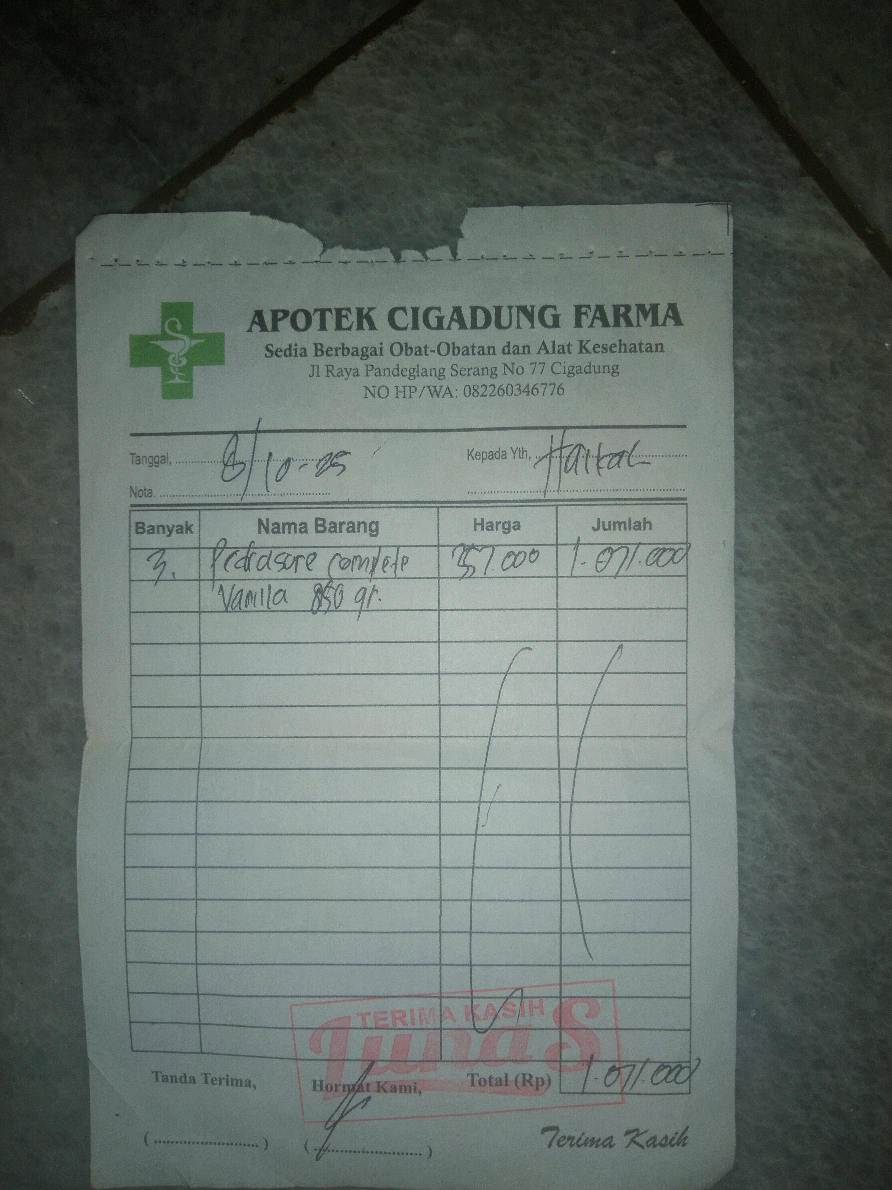 Untuk pembeliaan Nutrsisi susu pediasure complet 3 kaleng 850 gram 361.500 x 3 = 1.084.500 untuk 8-9 hari2024-09-25 10:46:26