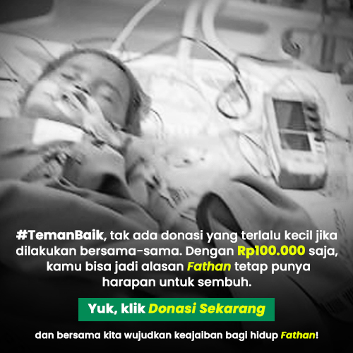 #TemanBaik, tak ada donasi yang terlalu kecil jika dilakukan bersama-sama. Dengan Rp100.000 saja, kita bisa jadi alasan Fathan tetap punya harapan untuk sembuh. Yuk, klik Donasi Sekarang dan bersama kita wujudkan keajaiban bagi hidup Fathan!