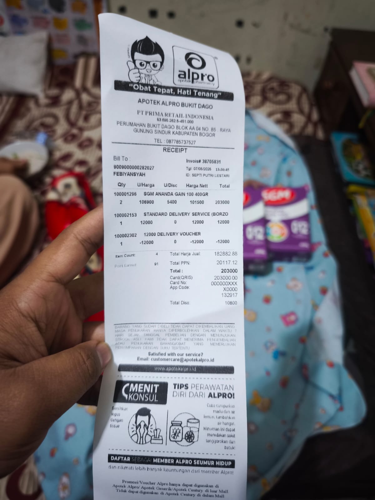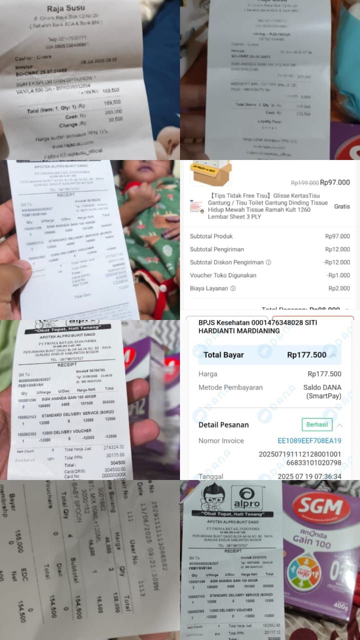 1. Reimburse isi ulang oksigen Rp140.000 2. Isi ulang tabung oksigen listrik Rp2.000.000 3. Susu SGM Gain Rp105.000 x 20 dus= Rp2.100.000 4. Tabung oksigen mini Rp525.000 x 2 = Rp1.050.000 5. Termometer Rp166.000 6. Tisue 20 pcs Rp154.000 7. Pampers NB Rp77.900 x 5ball Rp389.500 8. Obat ventolin 30 ampul x 13k = 390.000 9. Kontrol bulanan ke 3 dokter Rp290,000 10. Alat Steril Rp682,000 11. Alat Nebulizer Rp584.000 12. Transportasi mobil PP kerumah sakit Rp250.000 13. Bayar BPJS Agustus Rp177.002025-08-05 09:46:53