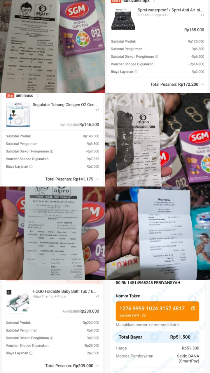 Dana digunakan untuk 1. Reimburse Biaya Berobat kontrol Ibrahim Rp290.000 2. Reimburse 2 Susu SGM Gain Rp203.000 3. Susu SGM Gain 100 0-1tahun Rp102.000 x 10 dus = Rp1.020.000 4. Pampers NB 70pcs Rp77.900 x 5ball = Rp389.000 5. Termometer digital bayi Rp166.000 6. Tabung Oksigen 0,3m Tanpa isi 2 tabung= Rp736.000 7. Regulator Oksigen Rp143.500 x 3pcs = Rp429.000 8. Tisue 20 Pak Rp154.000 9. Baby bath termometer Rp150.000 10. Sprei Waterproof Rp150.0002025-05-19 14:18:39