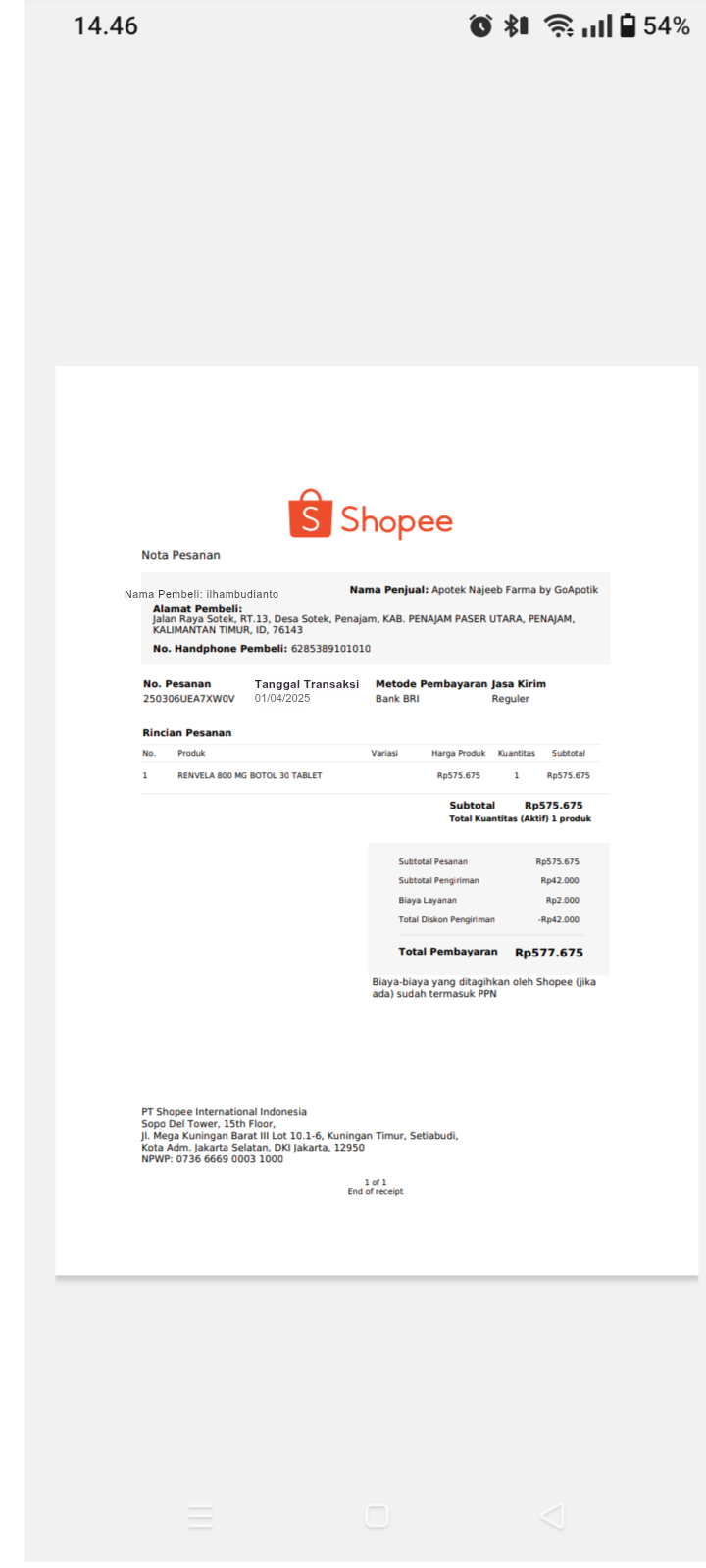 Dana digunakan untuk pembelian obat renvela yang tidak di cover BPJS Rp577.675 x 2 botol = Rp1.155.350 (1 botol isi 30).2025-03-21 09:44:47