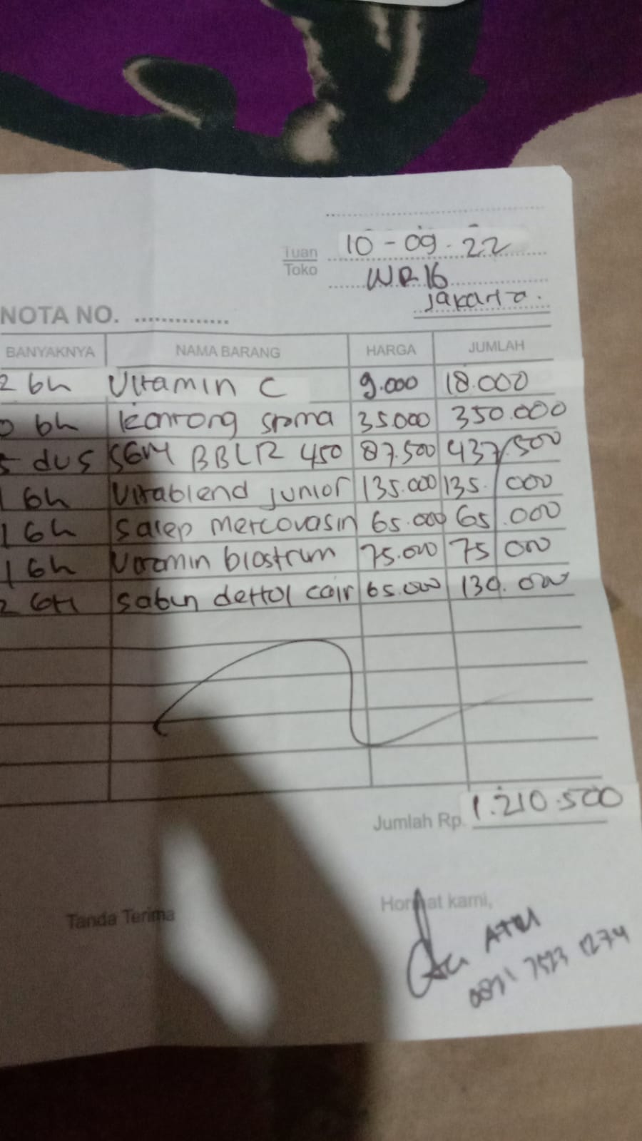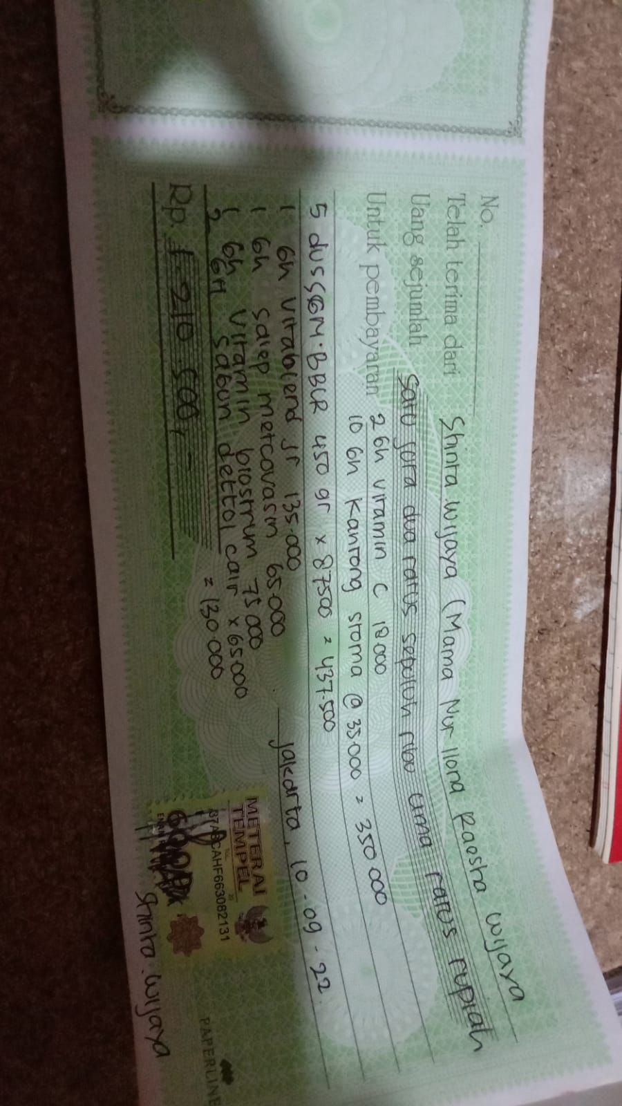 Rp 680.000 untuk membeli kantong usus 20 buah selama 3 minggu, Rp 383.450 untuk membeli susu formula khusus selama satu Bulan (SGM BBLR 400gram 5 buah dan SGM BBLR 200gram 1 buah ), Rp 350.000 untuk biaya check up ke RS2022-07-21 18:26:42