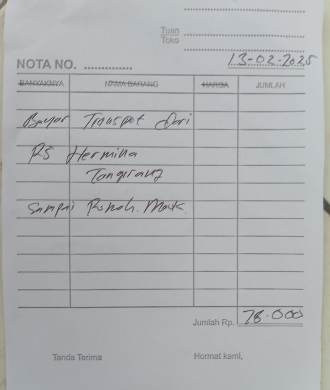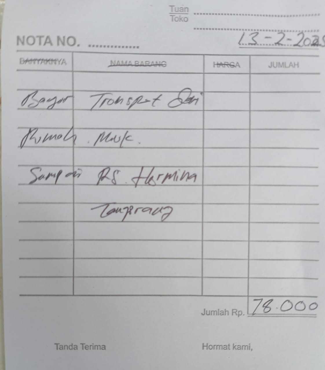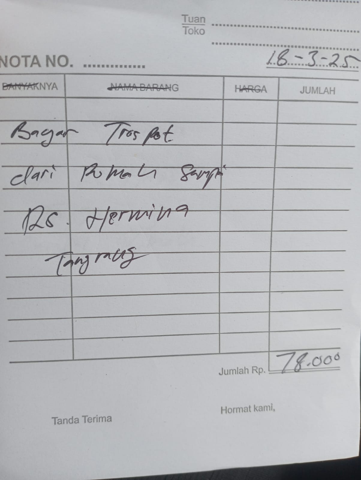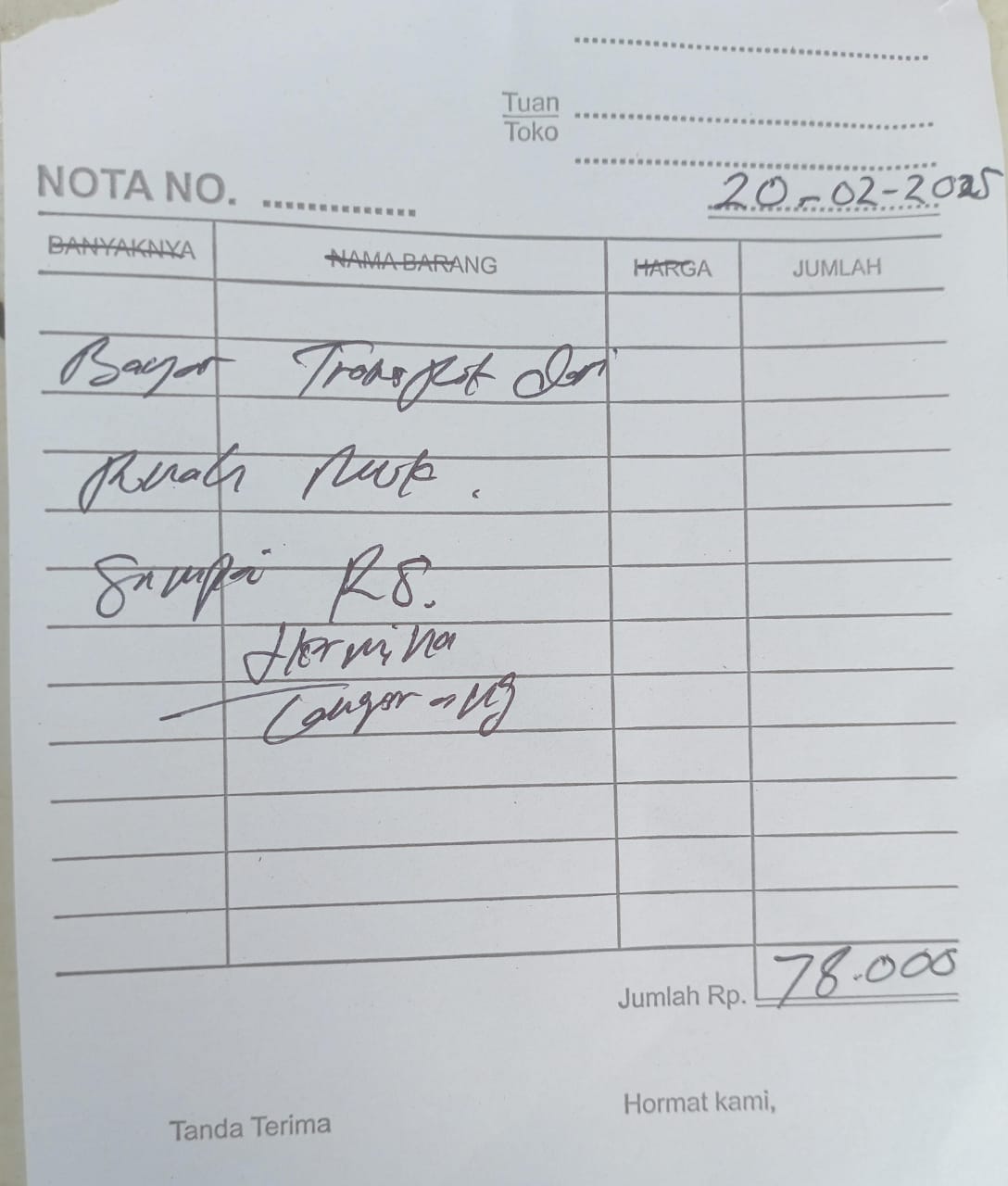 Dana digunakan untuk 1. Reimburse Sepatu Terapi Rp850.000 2. Transport Ke Hermina Ke An-nisa Naik Gojek Rp156.000 pp x 3 kali kontrol = Rp468.000 3. Pampers Rp70.000 x 3 ball = Rp210.000.2025-02-07 09:48:58