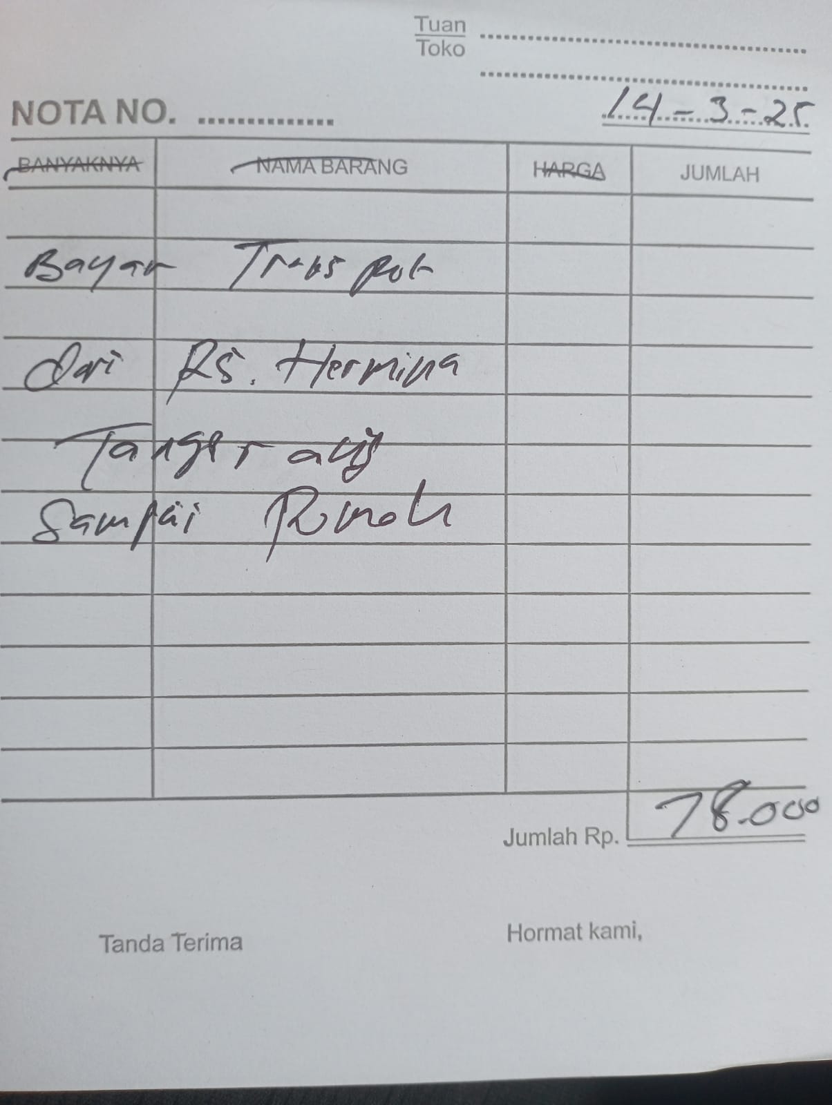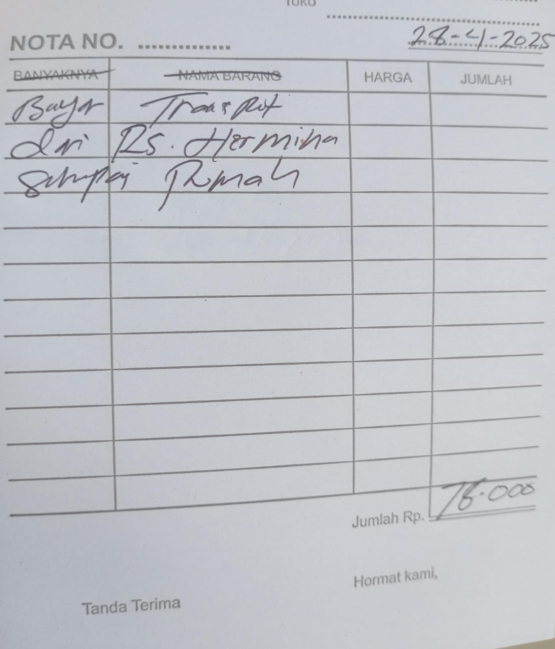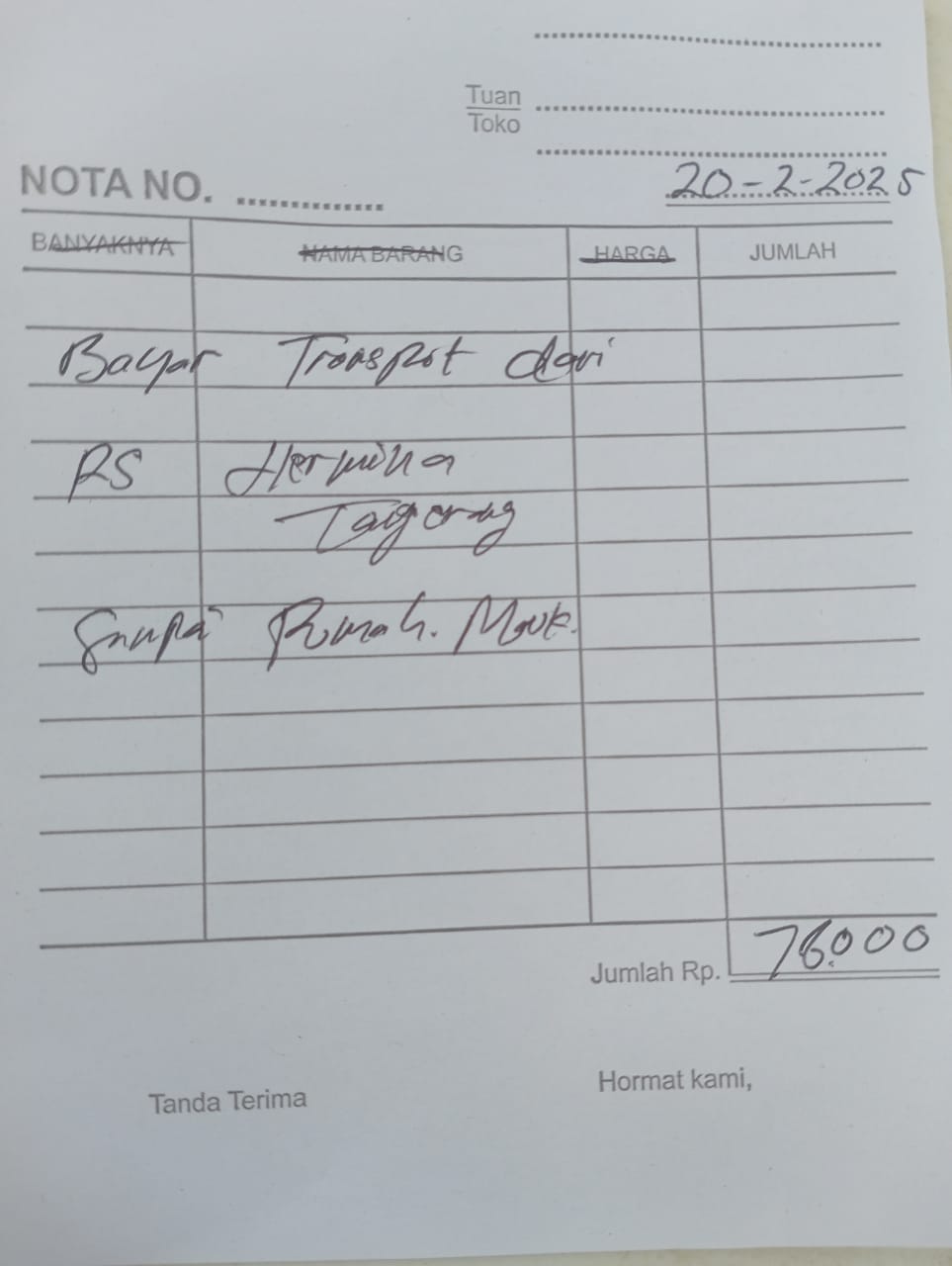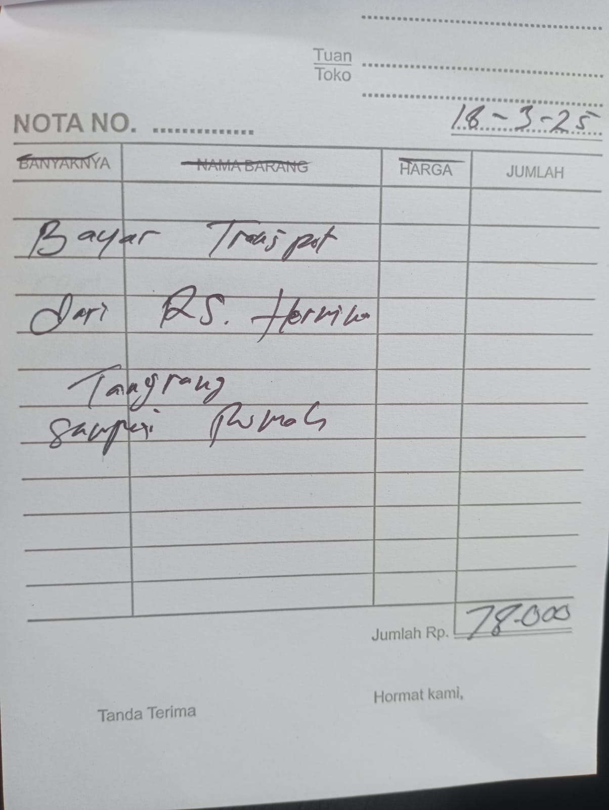 Dana digunakan untuk 1. Reimburse Sepatu Terapi Rp850.000 2. Transport Ke Hermina Ke An-nisa Naik Gojek Rp156.000 pp x 3 kali kontrol = Rp468.000 3. Pampers Rp70.000 x 3 ball = Rp210.000.2025-02-07 09:48:58