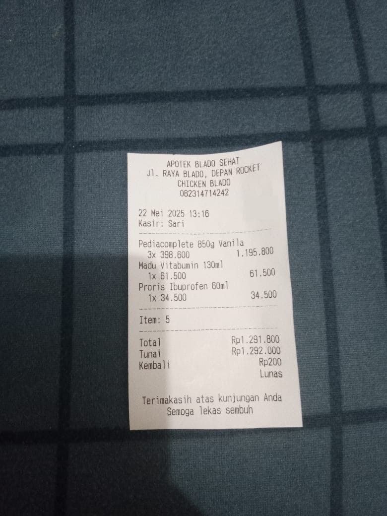 Susu SGM optigrow 400grm Rp 112.000 x 8 kotak =Rp 896.000 Diapers merries L28 Rp 77.000 x 3ball =Rp 231.000 Omron nebulizer NE C-101 =Rp 675.000 Sanmol Paracetamol sirup =Rp 25.000 Apexol ambroxol HCI =Rp 30.000 Curcuma plus Sharpy =Rp 28.500 Cessa happy nose 10ml =Rp 35.000 Uang makan 10hari =Rp 579.5002024-10-28 10:51:57