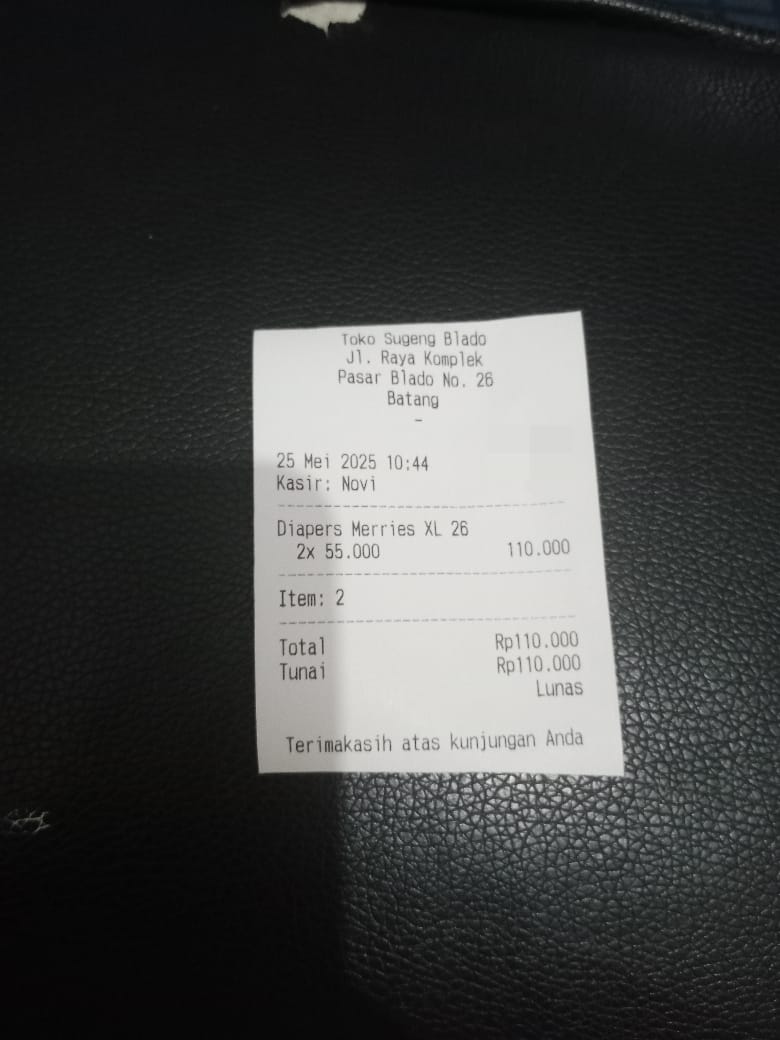 Dana ini saya gunakan untuk membeli susu, pampers, sabun mandi, salep popok bayi, minyak telon, tisu kering, dan obat diare untuk anak saya.