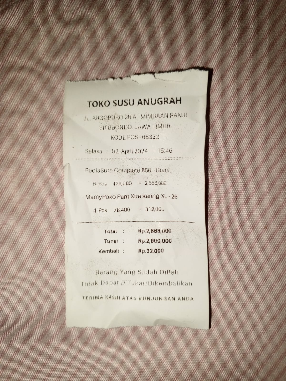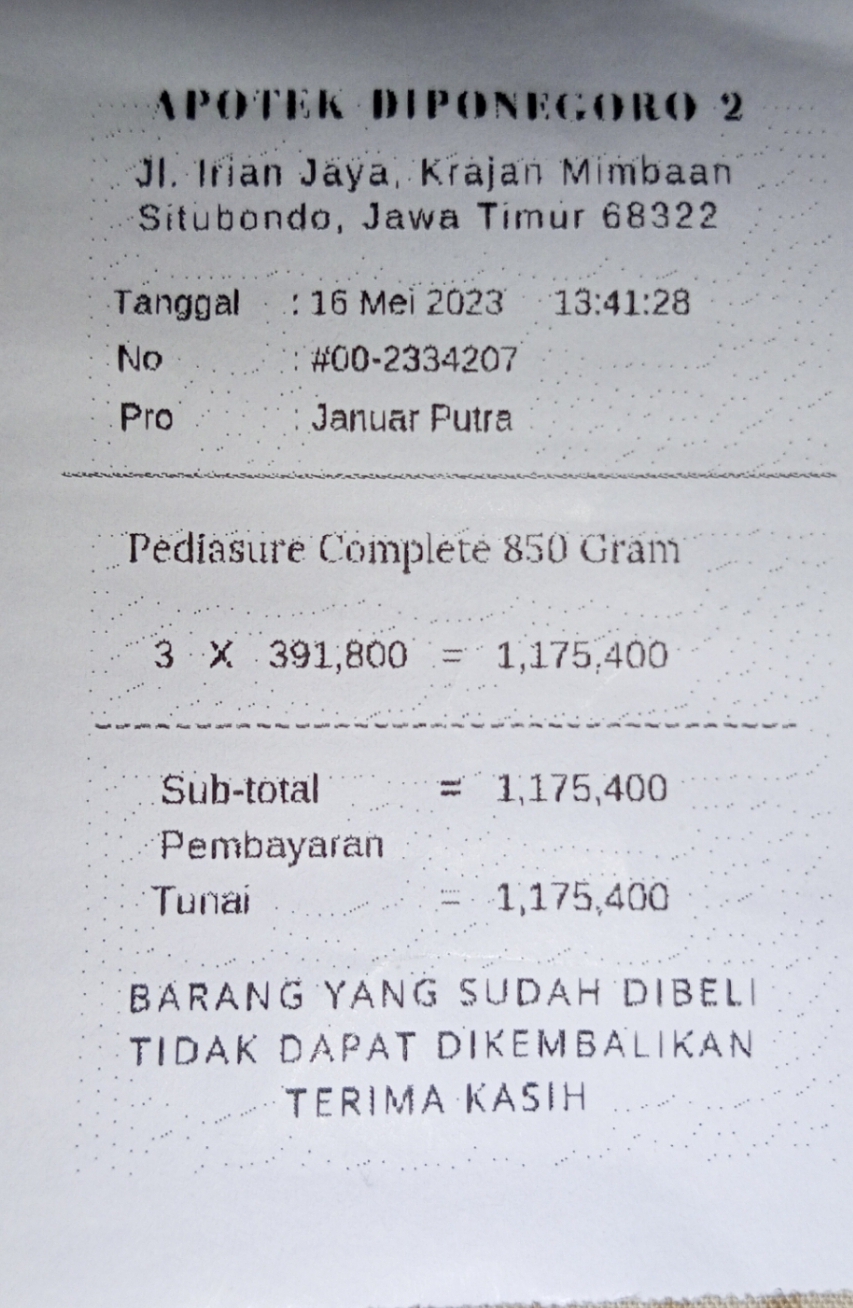 1. Susu Pediasure 850 gr 398.00 x 6 = Rp2.391.600
