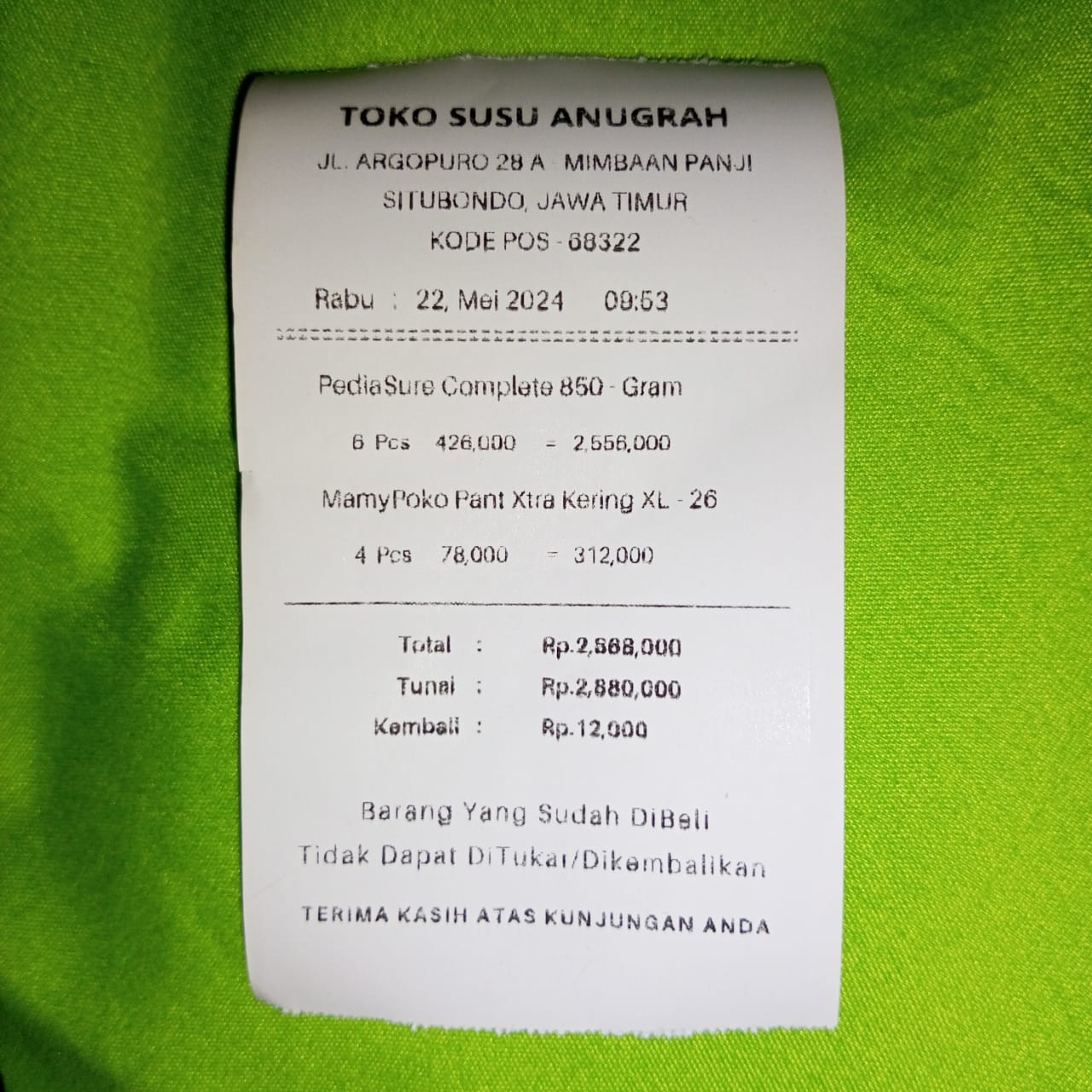 Dana digunakan untuk 1. Reimburse susu dan pampers bulan maret dan april Rp5.310.000 2. Susu Pediasure Rp426.000 x 6kaleng = Rp2.556.000 3. Pampers Mamypoko Rp78.000 x 4ball = Rp312.0002024-05-20 08:59:40