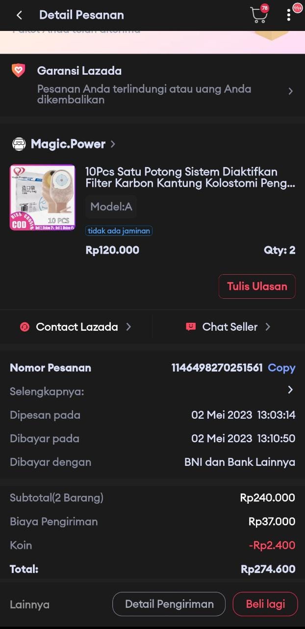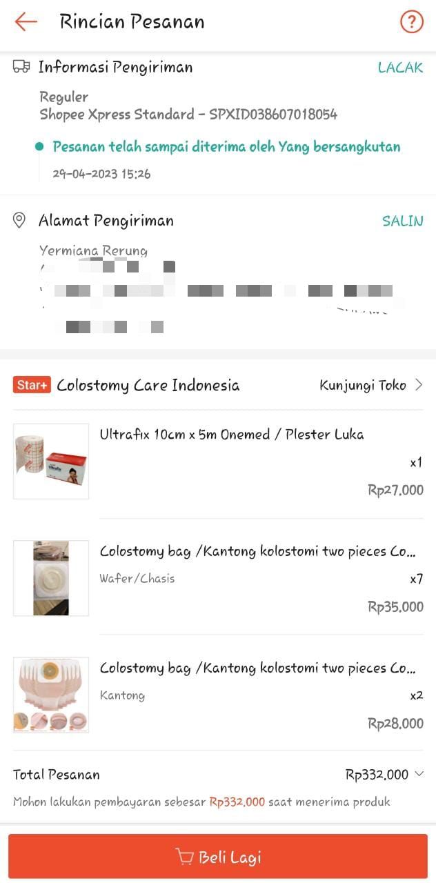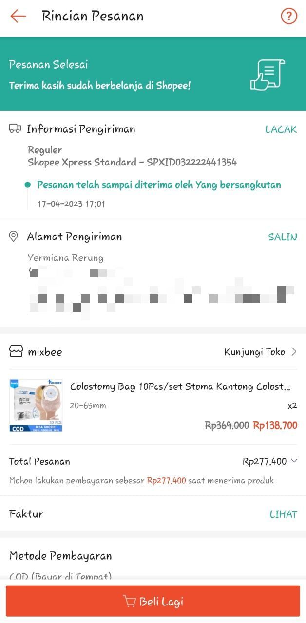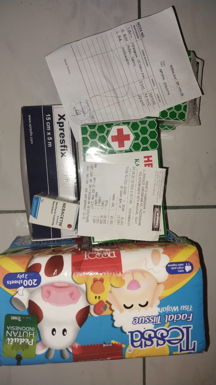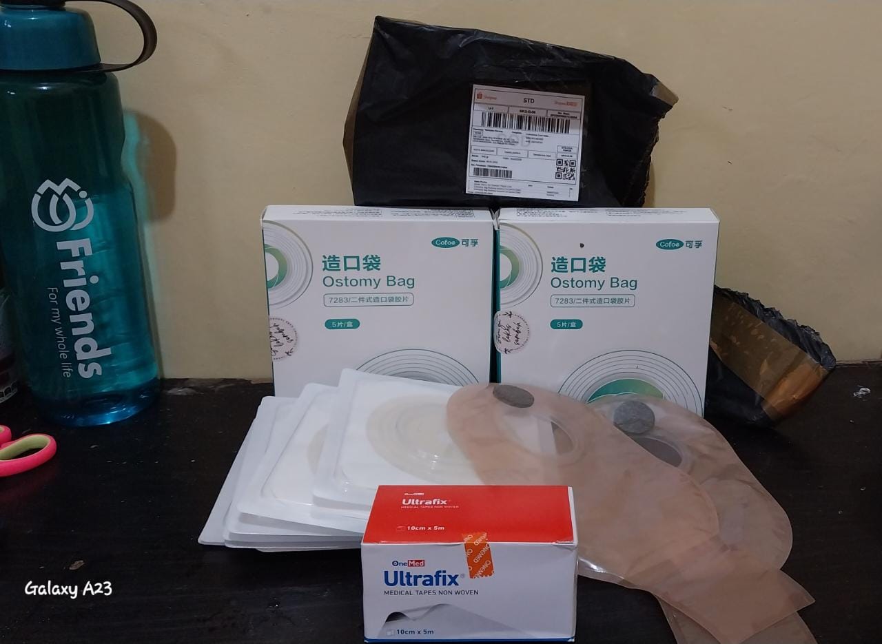 Bantuan dana dari TemanBaik sudah digunakan dengan baik untuk kantong kolostomi, susu, tisu, biaya transportasi online ke RS Wahidin Makassar, dan biaya makan pendamping selama perawatan kemoterapi.