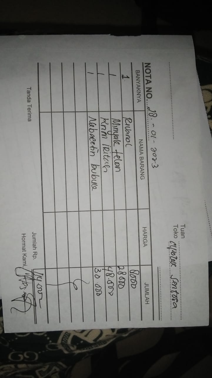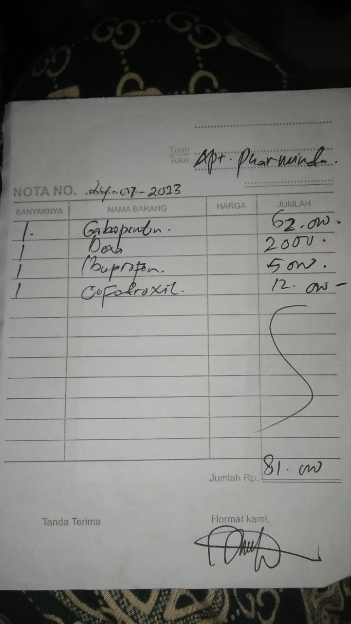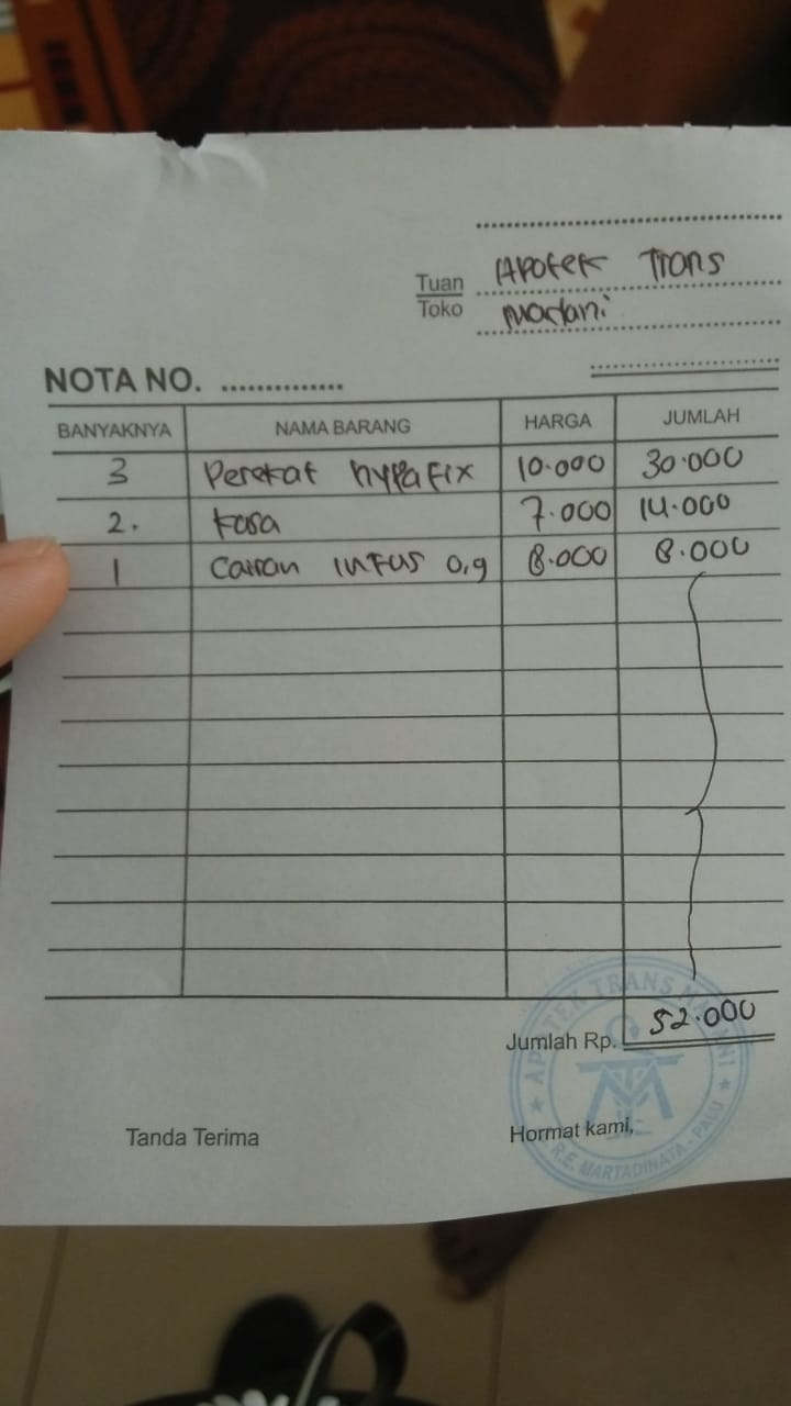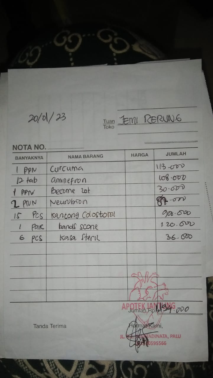 Dana digunakan untuk 1. Susu Milo coklat 1 kg 93.500 x 3= Rp280.500 2. Kantung kolostomi 60.000 x 20 pcs= Rp1.200.000 3. Tisu Nice 700 gr 40.000 x 5= Rp200.000 4. Biaya penggantian pembelian obat Curcuma, Amnefron, Becomezet, Neurobion, kantung kolostomi, handscoon, kasa steril Rp1.194.000 5. Biaya penggantian pembelian obat Rivanol, minyak telon, krim iritasi, Nebacetin bubuk Rp114.000 6. Biaya penggantian pembelian obat Gabapantine, Dexa, Ibuprofen, Cefadroxil Rp81.0002023-01-31 17:23:10