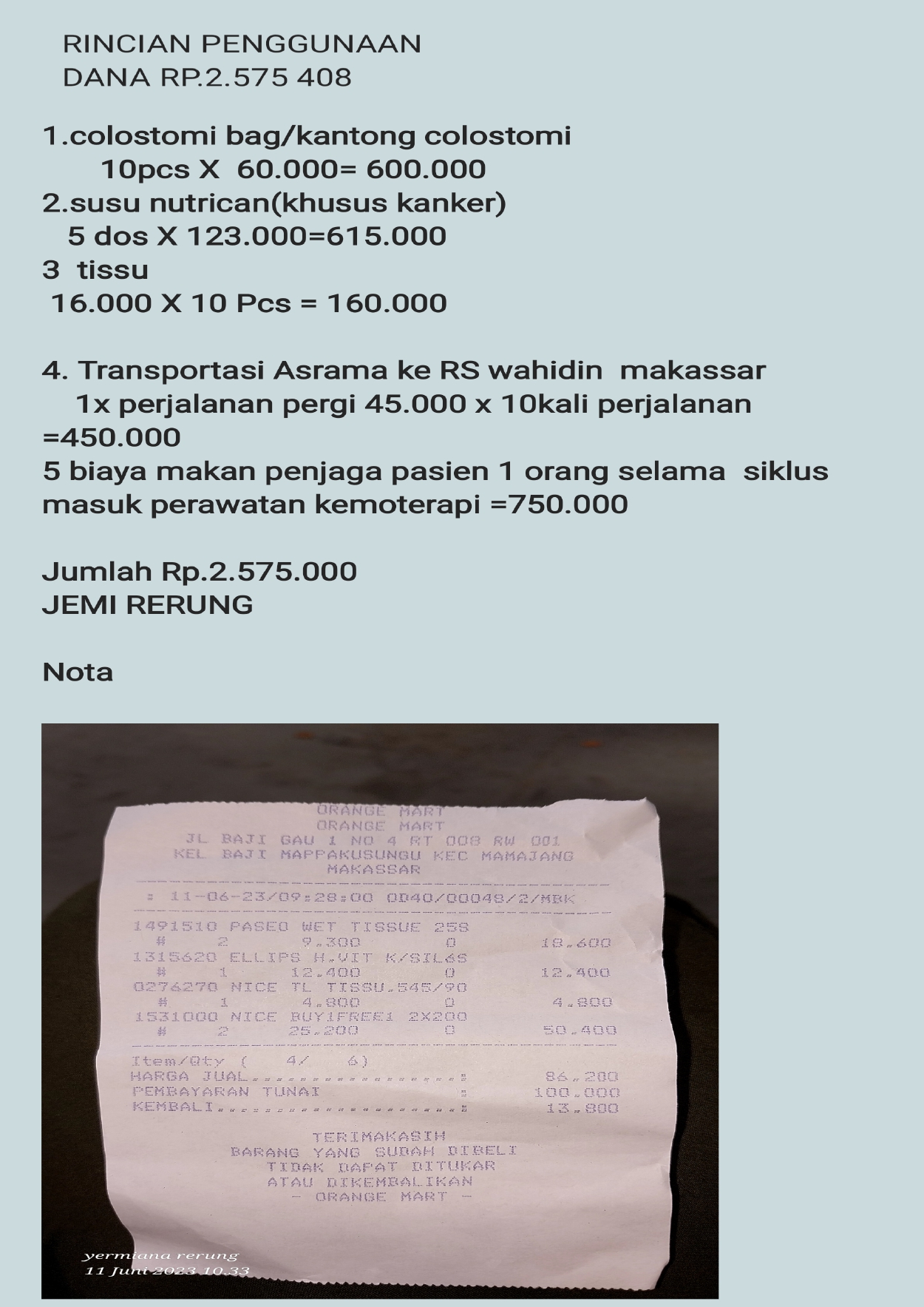 Dana digunakan untuk 1. Kantung kolostomi 60.000 x 10 pcs= Rp600.000 2. Susu Nutrican 123.000 x 5 kotak= Rp615.000 3. Tisu 16.000 x 10 pcs= Rp160.000 4. Biaya transportasi grab car ke RS Wahidin Makassar 45.000 x 10 kali perjalanan= Rp450.000 5. Biaya makan pendamping selama perawatan kemoterapi Rp750.000.2023-06-07 16:08:42