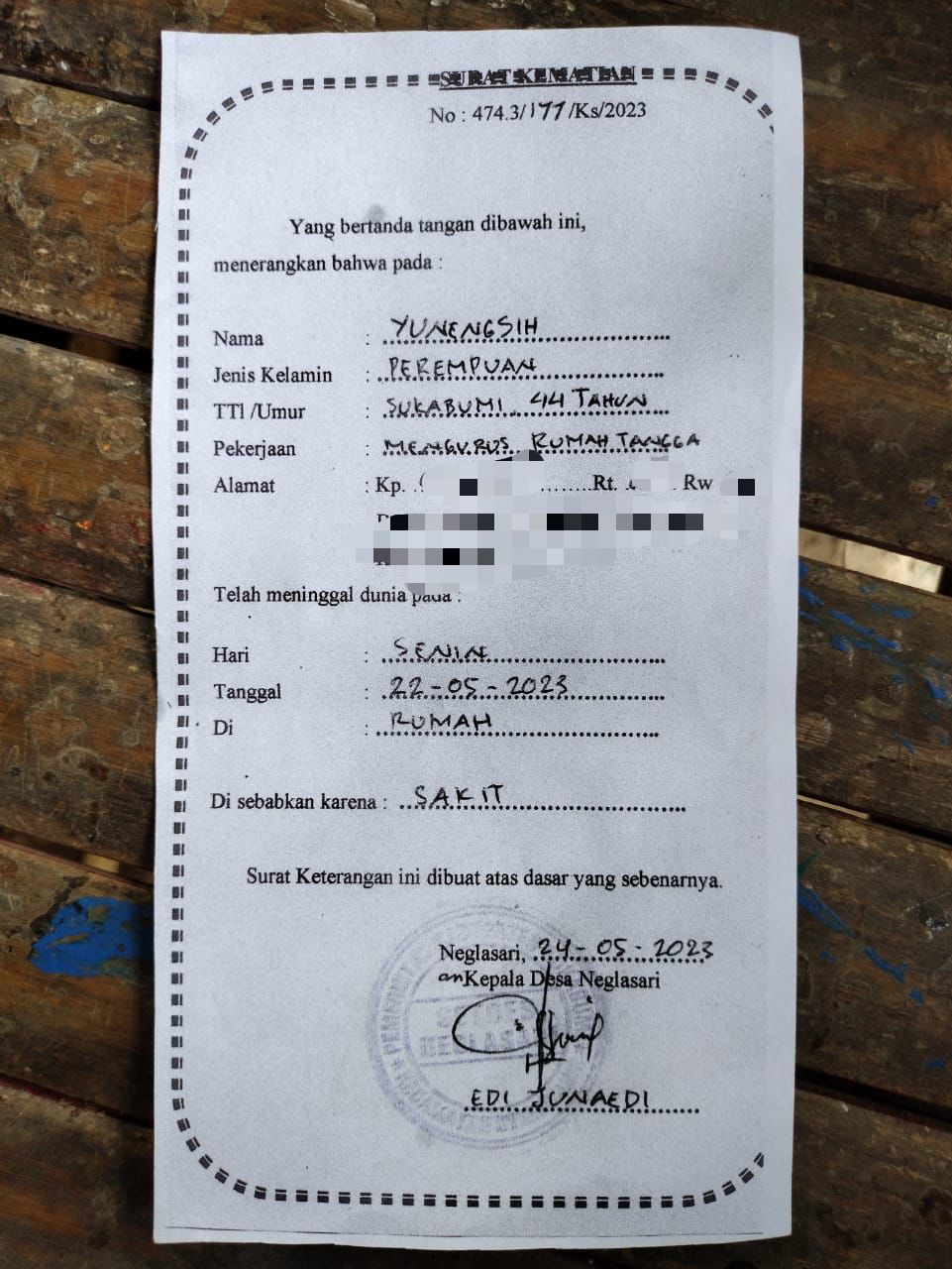 Aku ingin mengabarkan tentang ibuku yang sudah meninggal dunia pada Senin 22 Mei 2023, pukul 12.30.