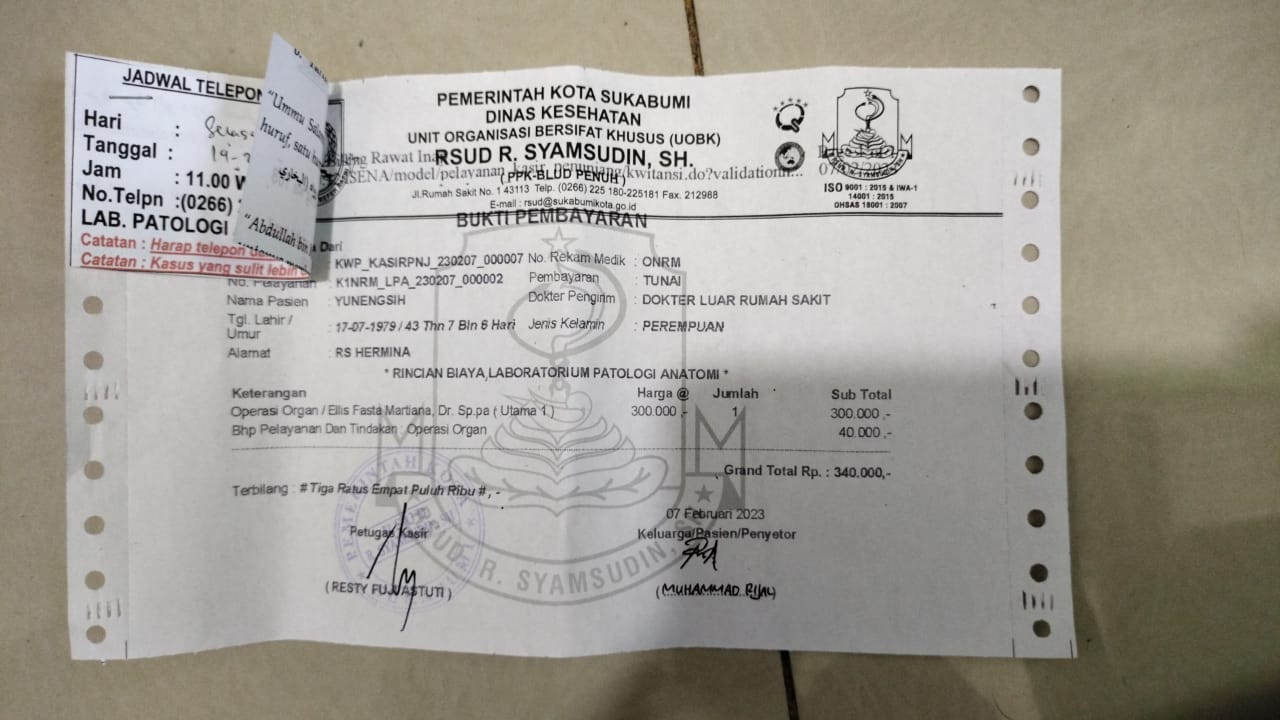 Dana dari TemanBaik digunakan dengan baik untuk biaya penggantian laboratorium patologi anatomi dan biaya makan selama di rumah sakit.