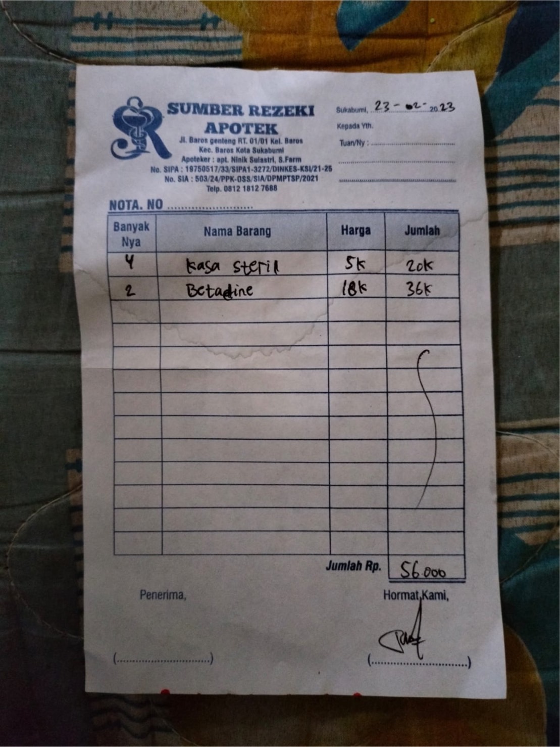 Dana digunakan untuk 1. Kassa steril 4 box Rp20.000 2. Betadine 2 buah Rp36.000.2023-02-23 16:26:55