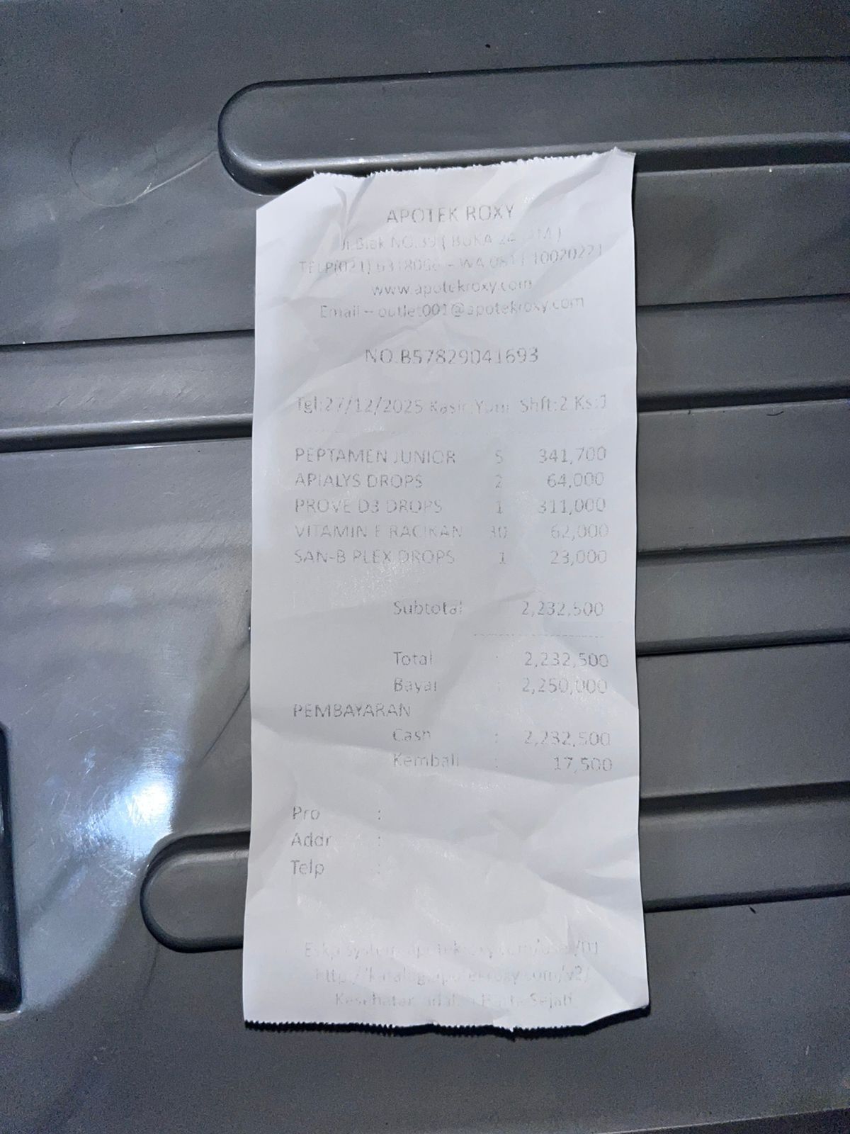 Dana digunakan untuk 1. Susu peptamen Rp350.000 x 5kaleng Rp1.750.000 2. Vitamin apialis Rp60.000 x 2botol = Rp120.000 3. Vitamin E racikan Rp60.000 3. Vitamin proven D3 tetes Rp300.000 4. Vitamin B racikan Rp20.0002024-10-28 10:52:12