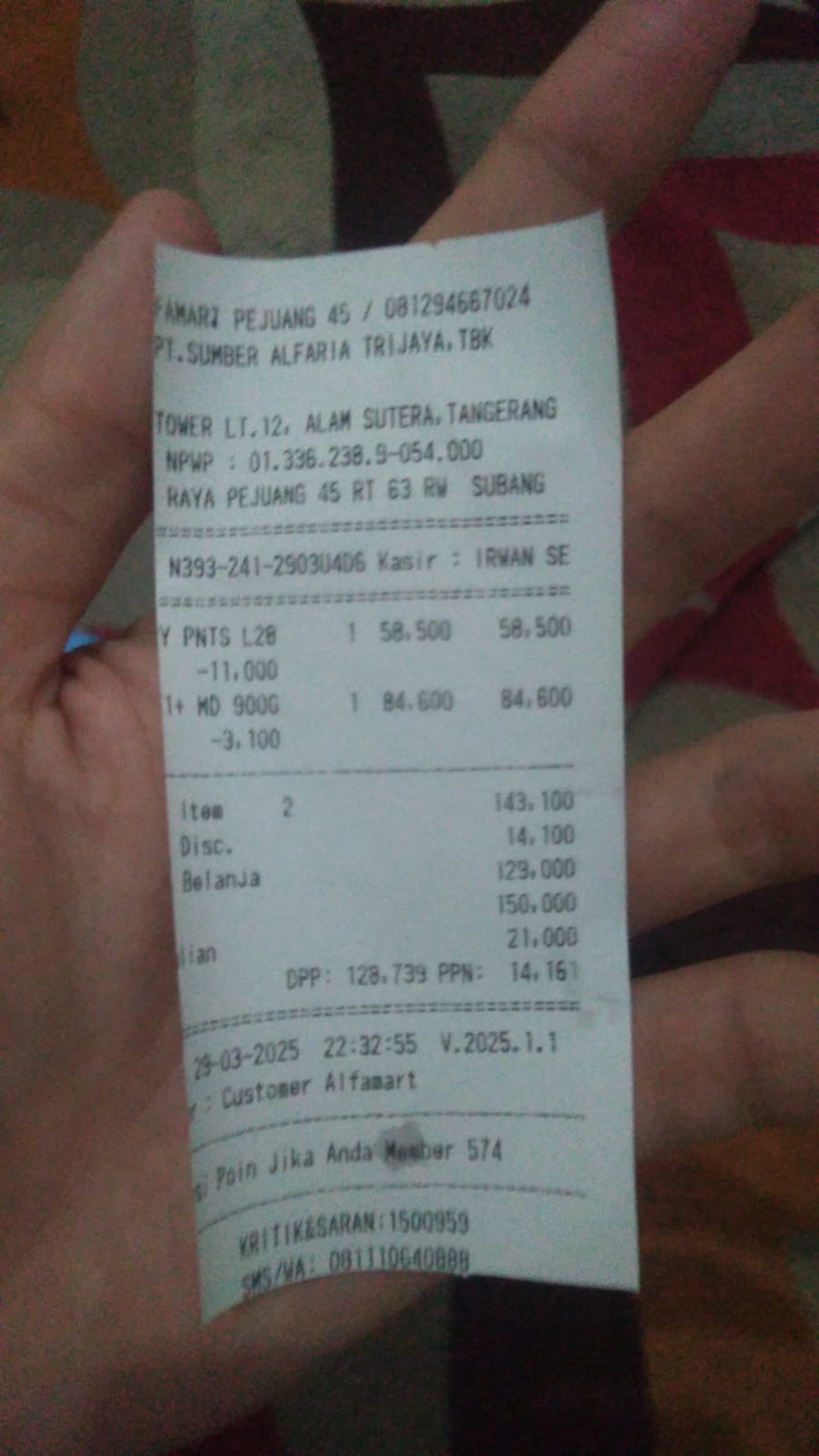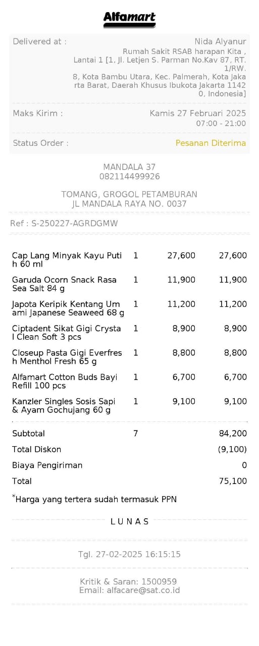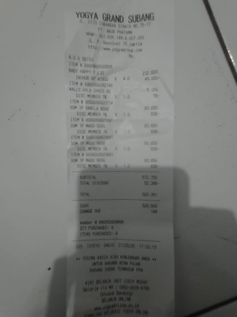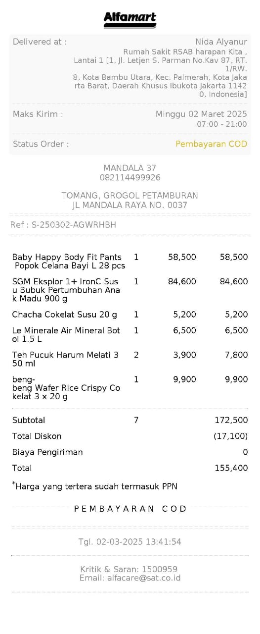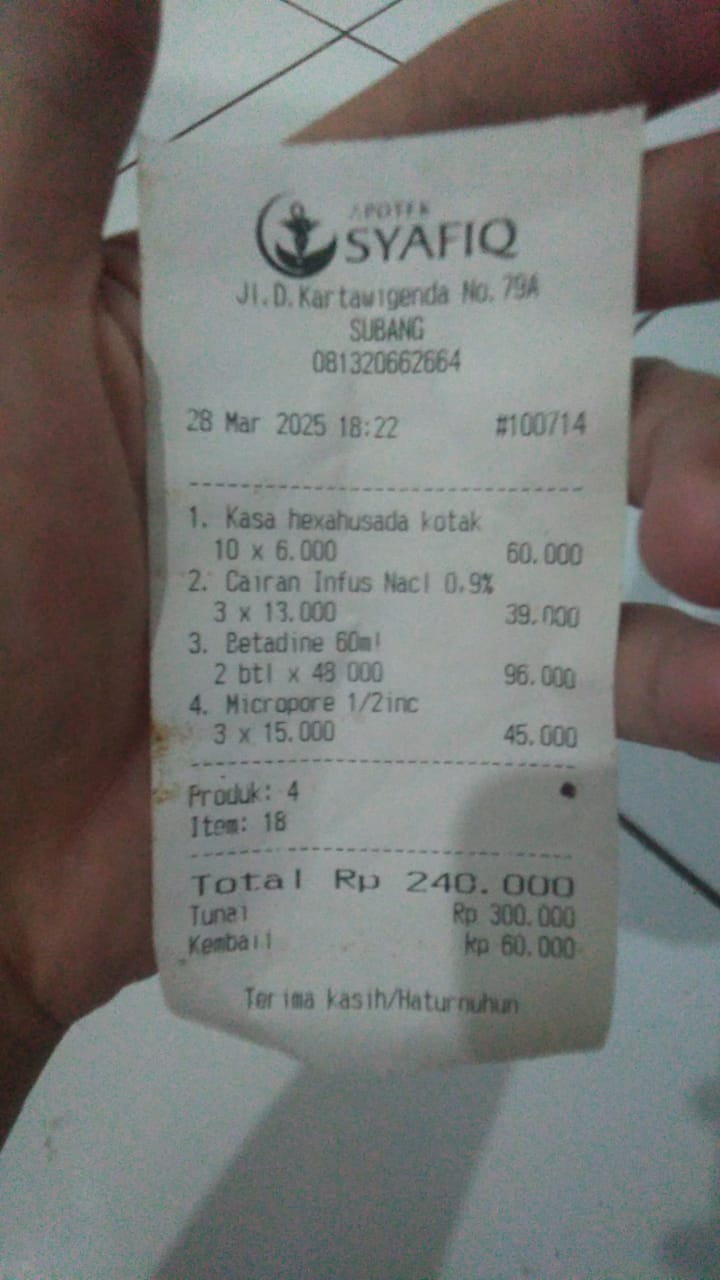 Dana digunakan untuk 1. Baby happy pants L28 Rp59.000 x 5 pcs = Rp295.000 2. Susu SGM 1+ 900Grm Rp88.900 x 7 box = Rp622.300 3. Betadine 30ml 3pcs Rp99.000 4. NACL 0,9% 25ml Rp12.000 x 15pcs = Rp180.000 5. KASA HYDROFIL Rp10.000 x 15pcs= Rp150.000 6. Antiseptic surgical scrub 2% one 5botol Rp36.500 x 2pcs = Rp182.5002025-03-28 09:19:30