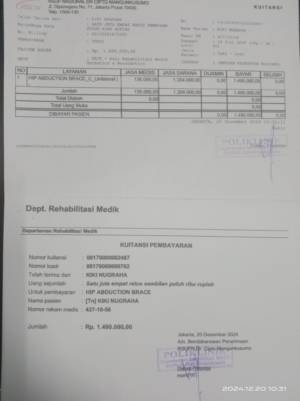 Dana digunakan untuk pembelian alat Hip abduction brace Rp1.490.0002024-12-20 10:03:51