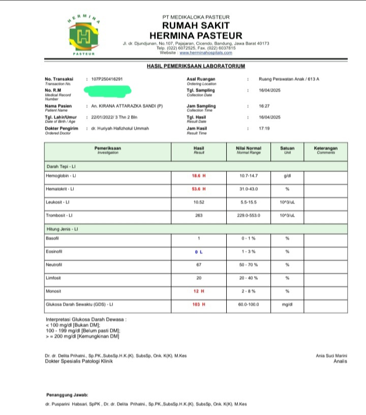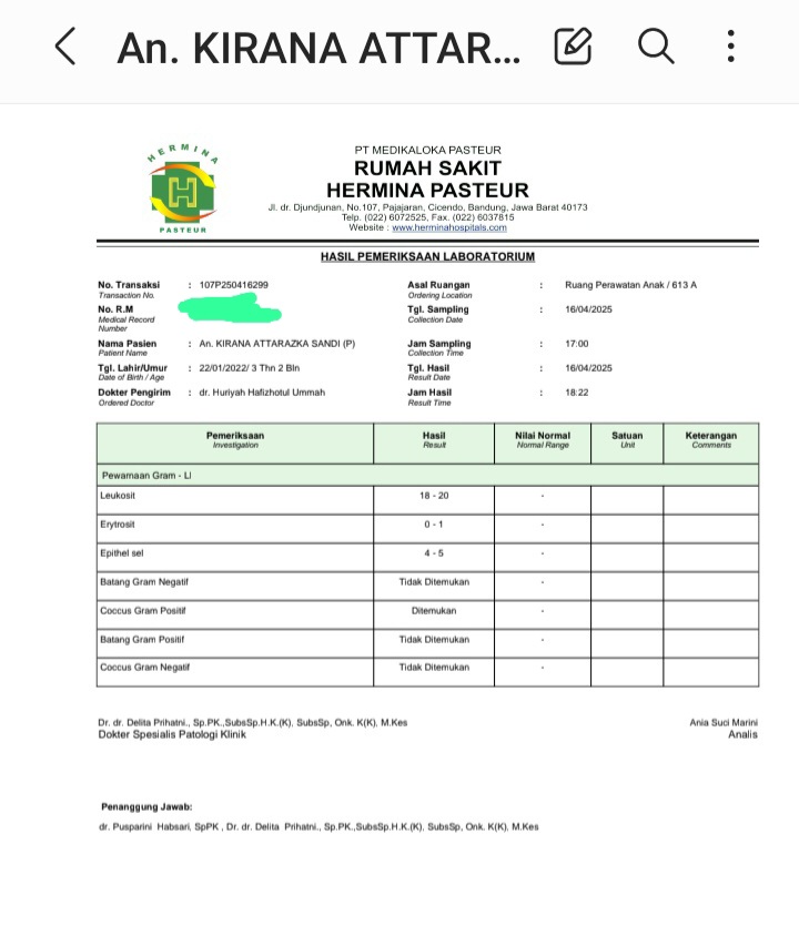 Saya ingin menyampaikan kondisi Kirana yang saat ini sedang dirawat di RS Hermina Pasteur Bandung. Kirana sudah 4 hari mengalami demam disertai batuk dan pilek, dengan suhu tubuh yang naik turun. Selain itu, Kirana juga mengalami diare selama 3 hari, dengan frekuensi BAB lebih dari 7 kali dalam sehari, yang membuat kami khawatir akan risiko dehidrasi. Saturasi oksigennya pun menurun.