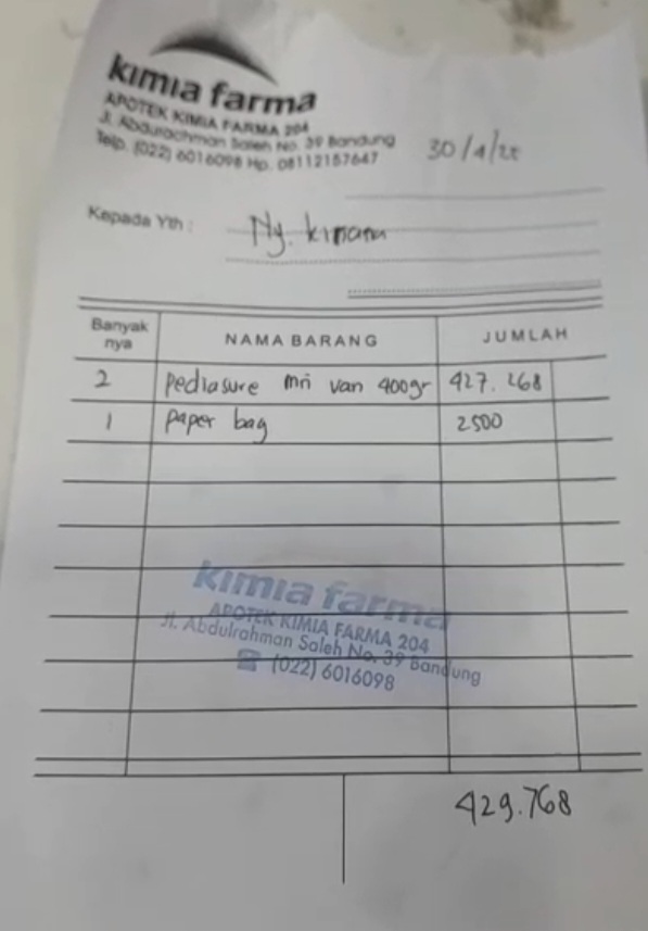 untuk pembelian susu pediasure 6 kaleng ukuran 400gr 213.634x6 = 1.281.8042024-10-14 09:24:10