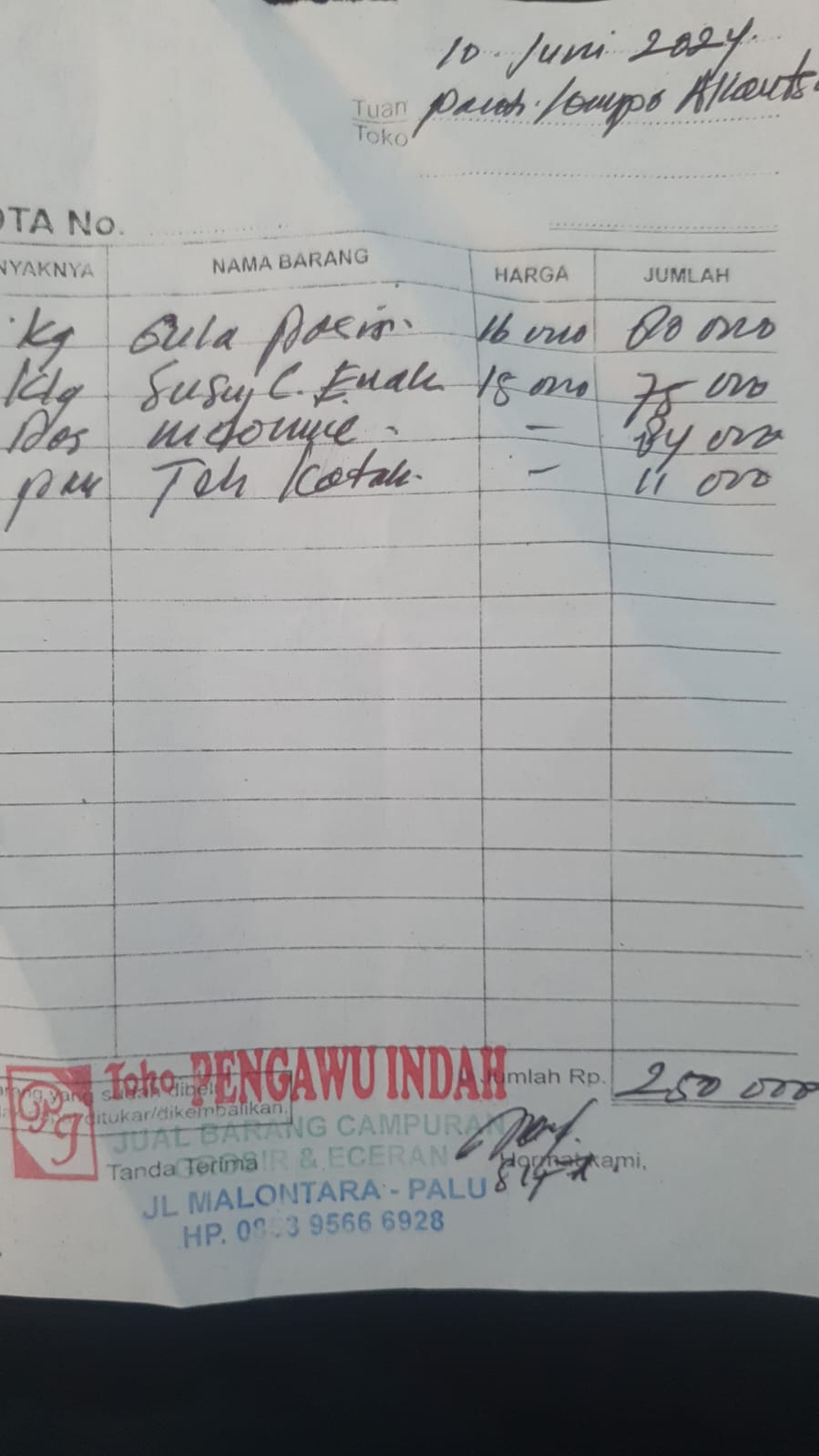 Dana digunakan untuk 1. Beras Rp15.000 x 25kg = Rp375.000 2. Indomie soto 1dus Rp80.000 3. Gula pasir Rp16.000 x 5kg = Rp80.0002024-09-24 11:24:23