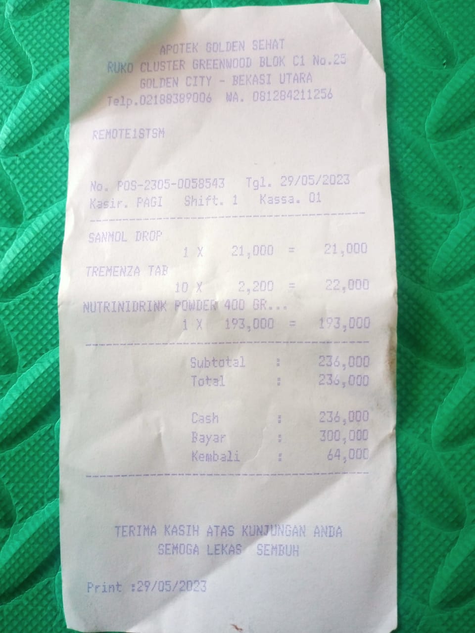 Dana digunakan untuk 1. Susu Nutinidrink Complete 400 gr 200.000 x 5 kaleng= Rp1.000.000. 2. Pampers Baby Happy Pants M 57.700 x 4= Rp230.800 3. Caplang telon 150 ml 53.100 x 4= Rp212.400 4. Tisu Passeo soft 19.900 x 5= Rp99.500 5. Biaya bensin dan konsumsi kontrol ke RS Primaya Bekasi Rp200.000.2023-05-30 14:58:49