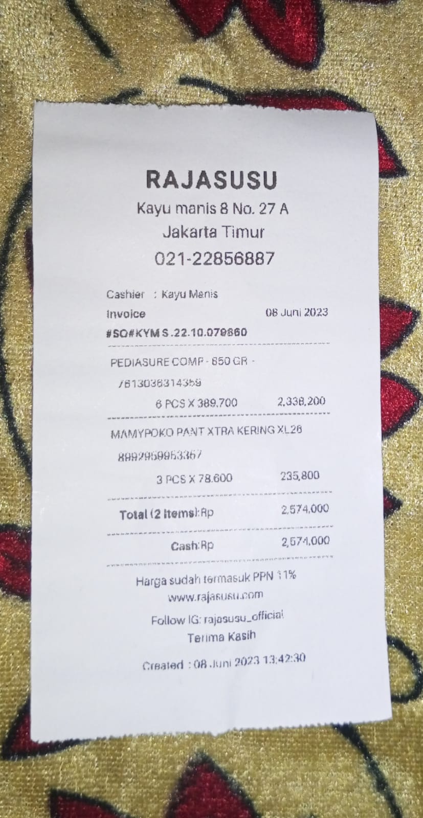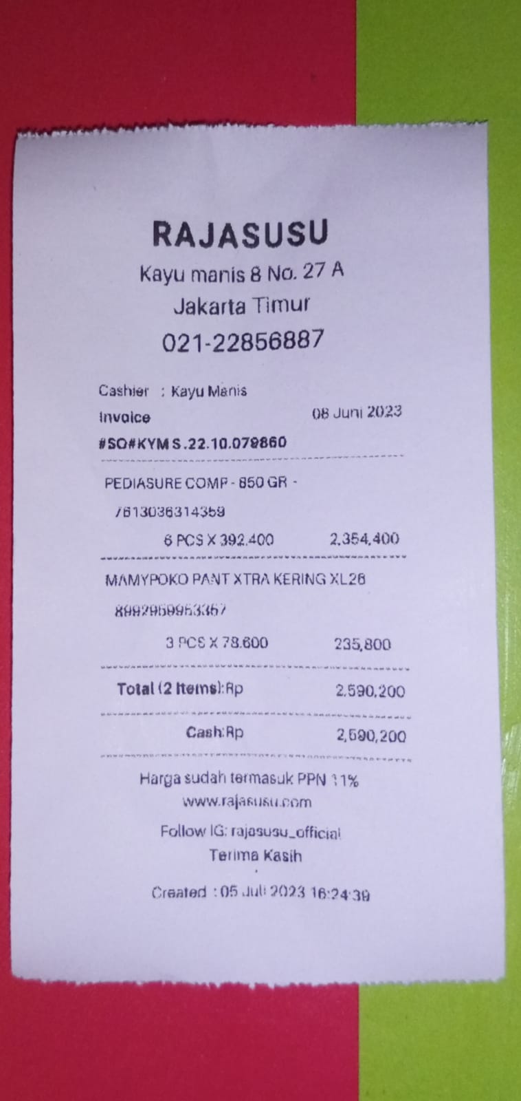 Dana digunakan untuk biaya penggantian pembelian Susu Pediasure Complete dan Pampers Mamypoko pada tanggal 5 Juli 2023 sebesar Rp2.590.200.2023-08-08 16:22:59
