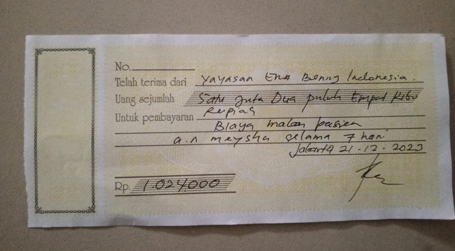 Dana dari #TemanBaik sudah kami gunakan untuk biaya makan Meysha dan ibunya selama 7 hari dalam persiapan proses operasi Meysha di RS Kanker Dharmais Jakarta.