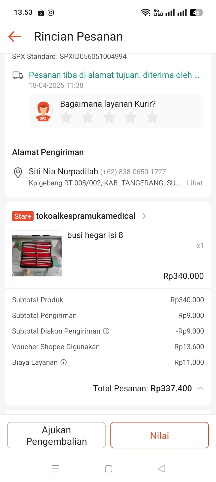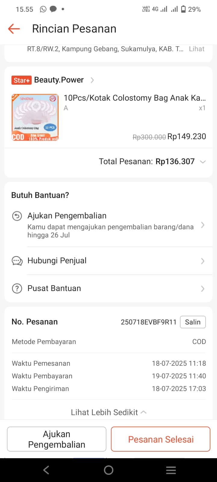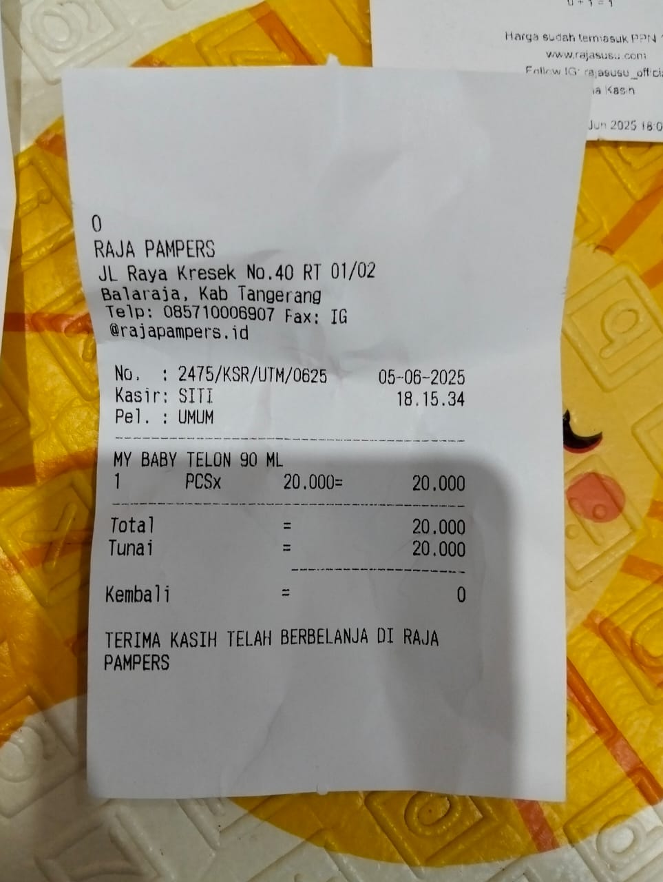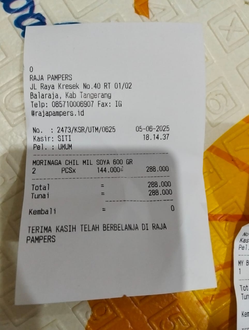 Dana digunakan untuk 1. Pampers mamy pokok Rp50.000 x 3 ball = Rp150.000 2. Susu Morinaga chilmil soya Rp144.000 x 2pcs= Rp288.000 3. Kantong Stoma Rp150.000 x 2pcs = Rp300.000 4. Bubur Milna Wgain Rp35.000 x 5dus = Rp175.0002025-06-05 09:31:45