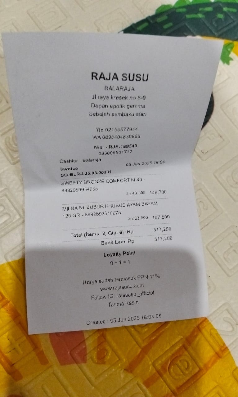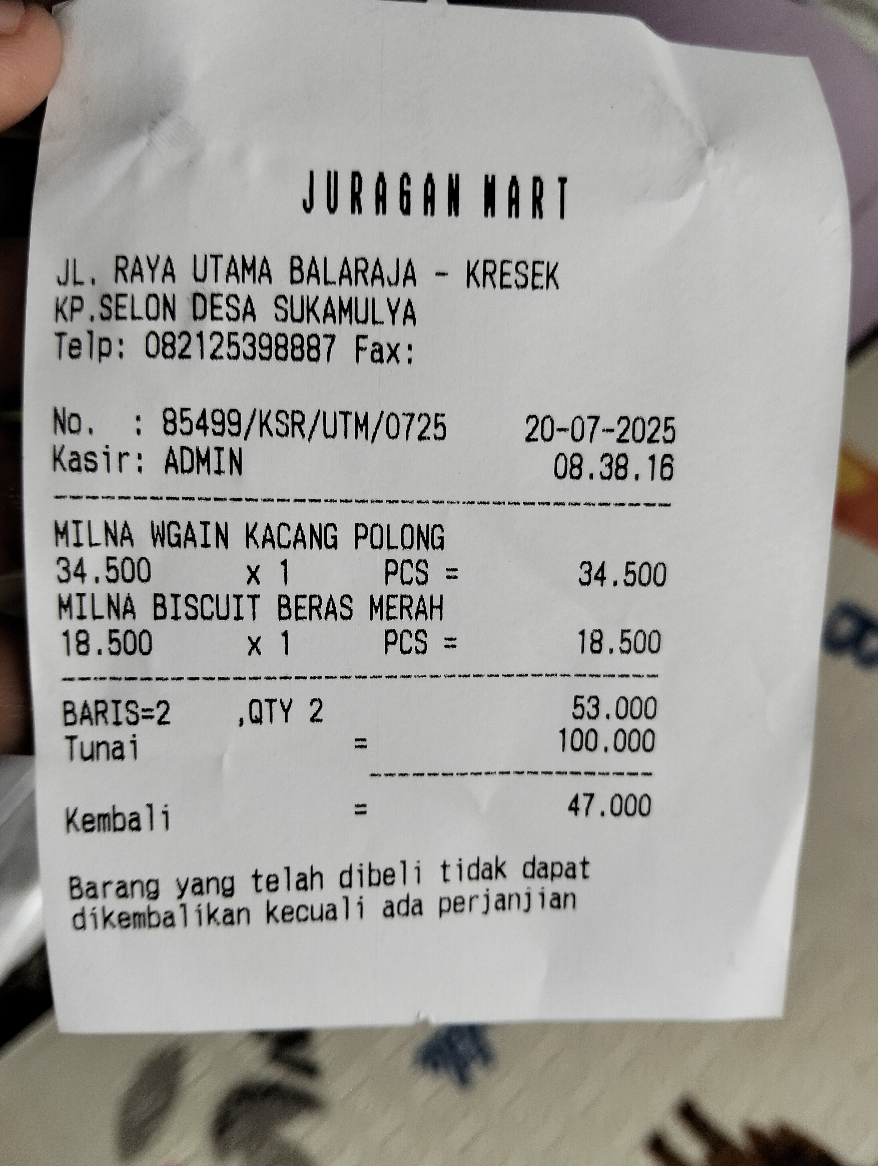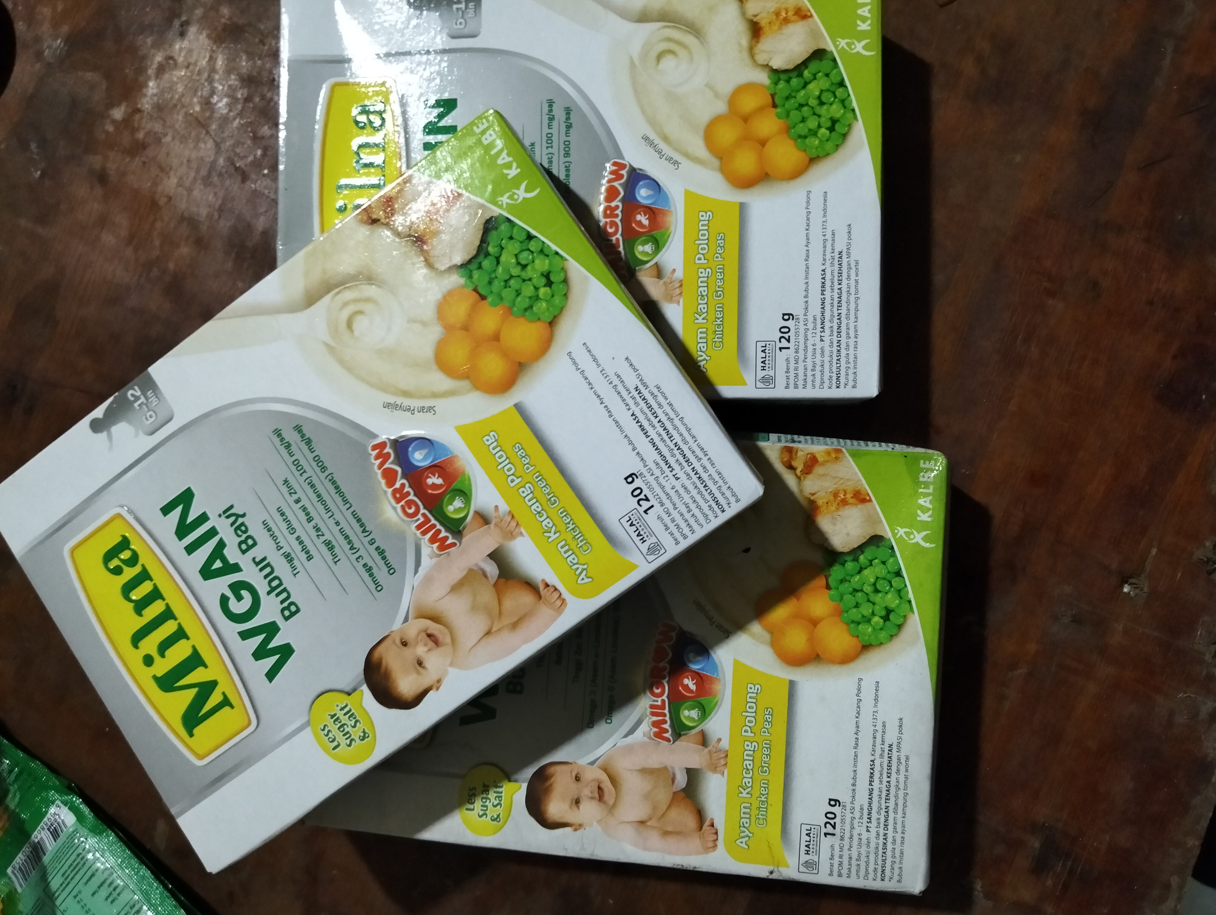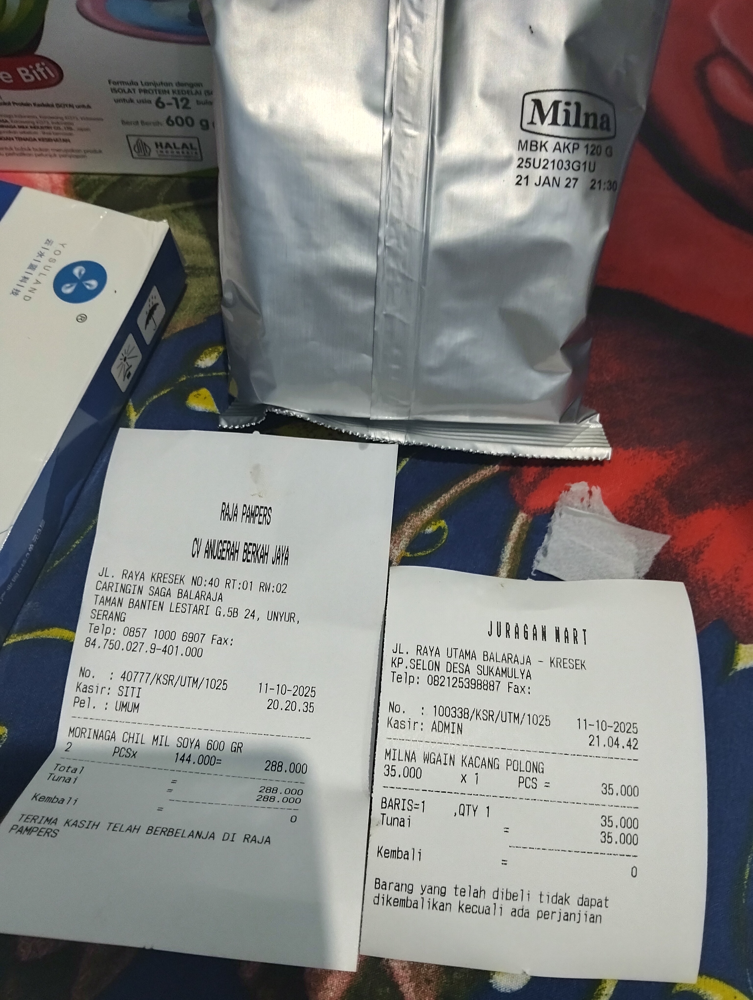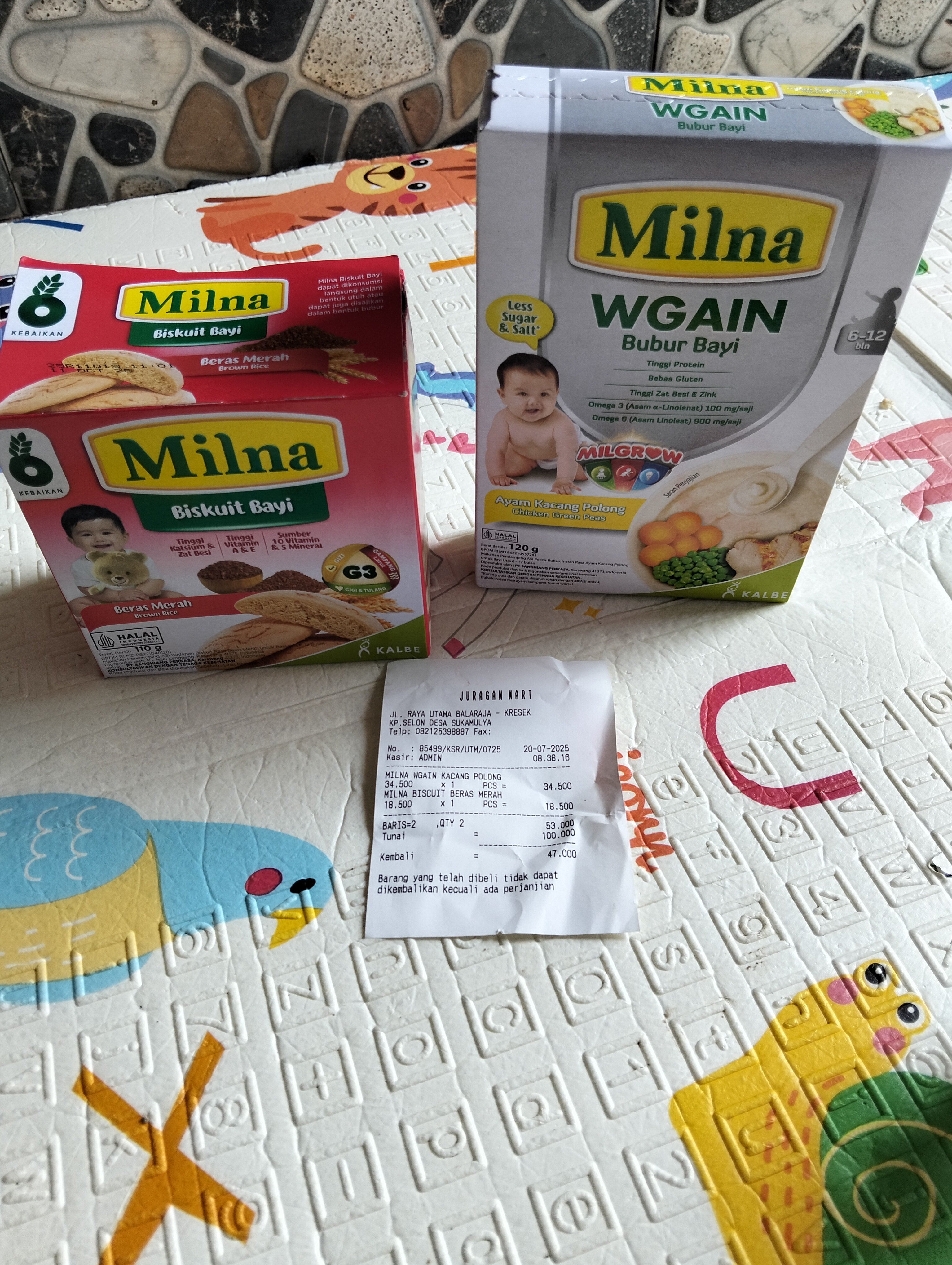 Sisa dana juga dimanfaatkan untuk membeli bubur Milna Wgain seharga Rp34.500 dan biskuit Milna seharga Rp18.500.
