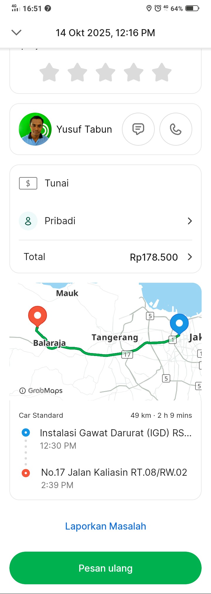 Ongkos Grab (PP Kampung Kaliasin – RSUD Tarakan) termasuk e-toll = Rp400.000