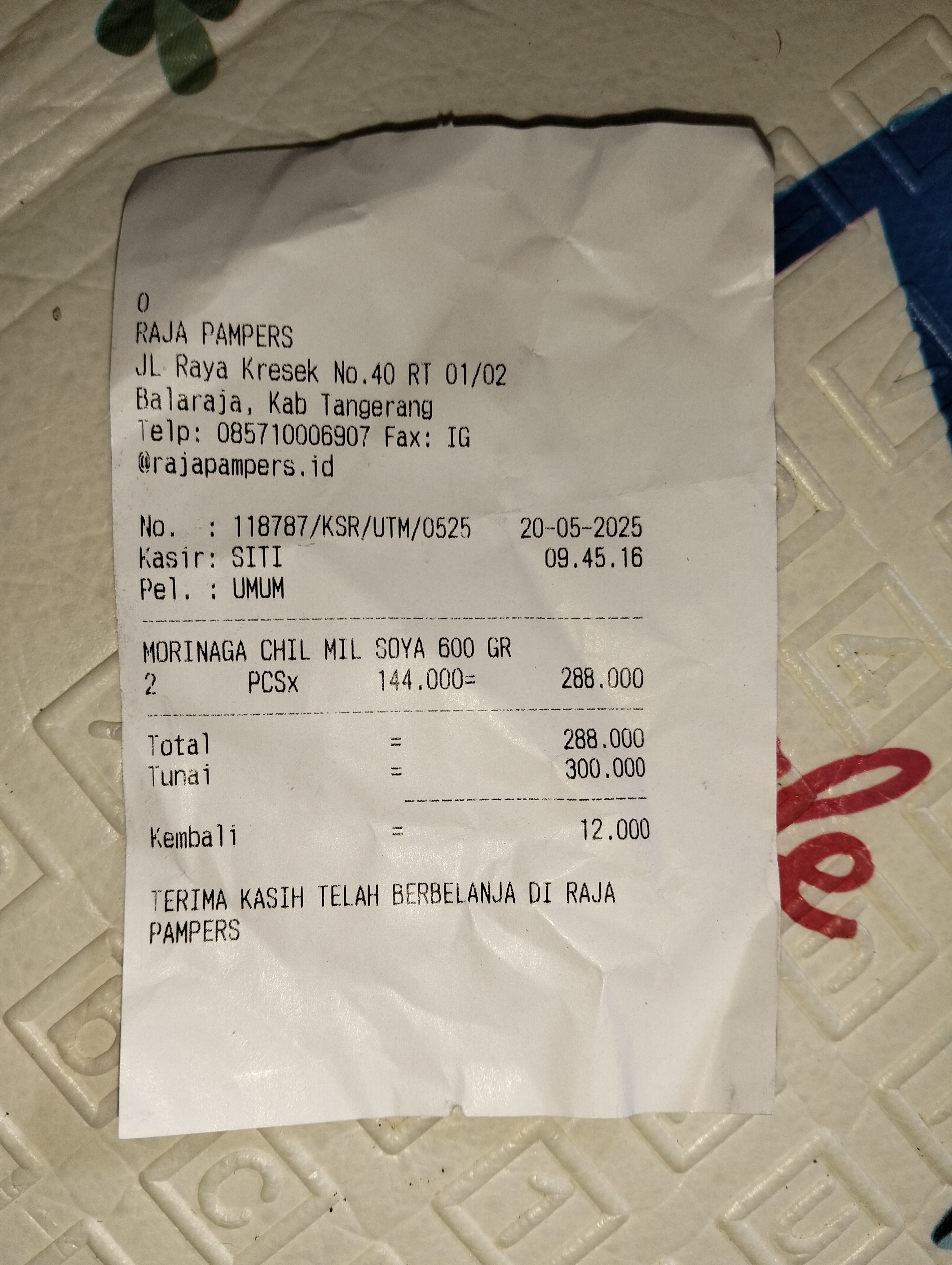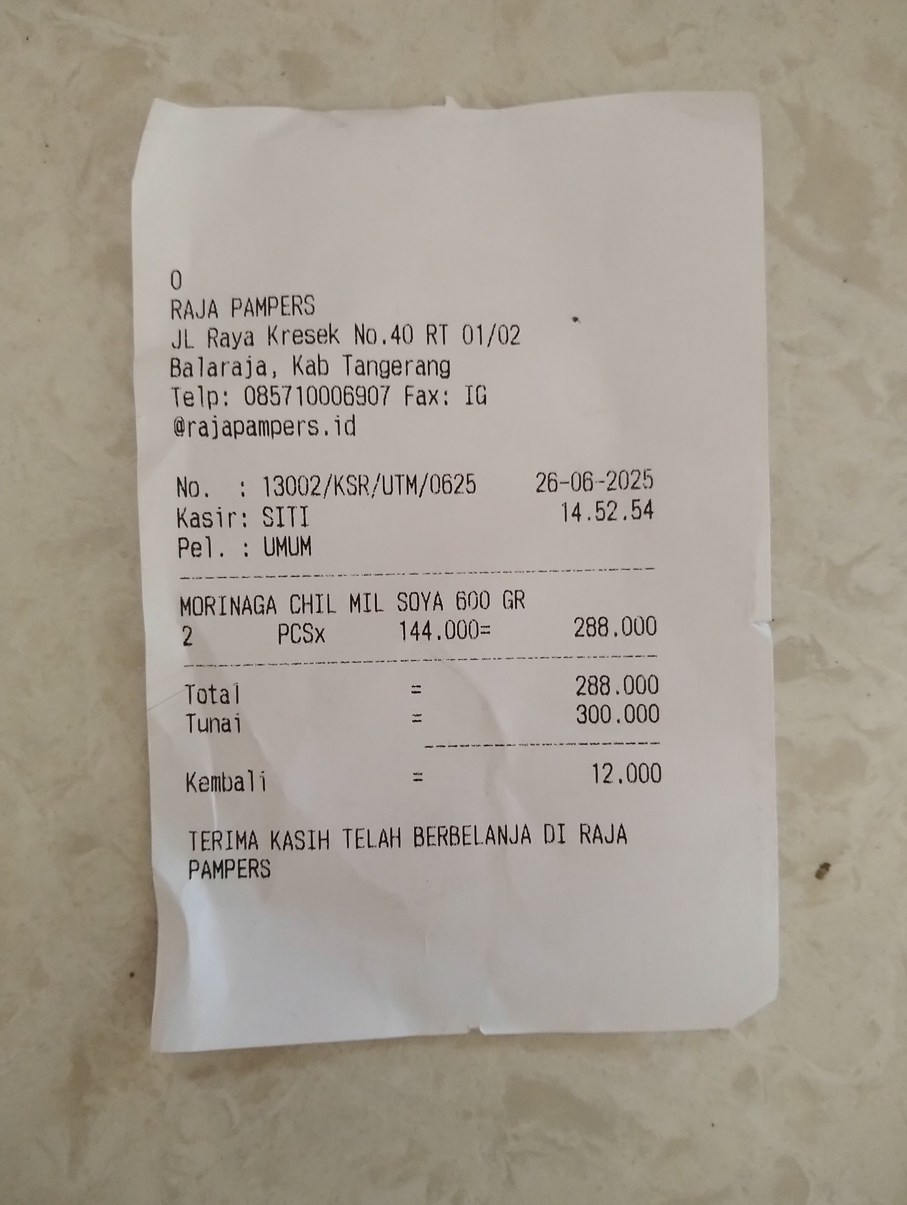 Susu Morinaga Chil Mil Soya 2 kaleng × Rp144.000 = Rp288.000