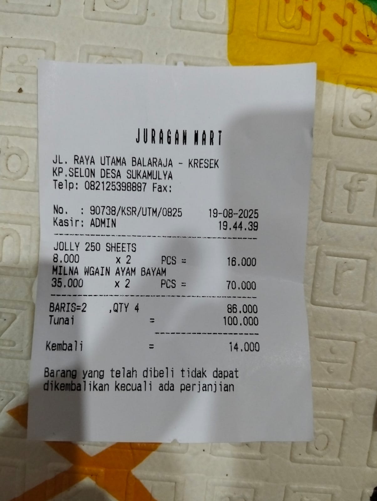 Tisu Jolly 2 x Rp8.000 = Rp16.000