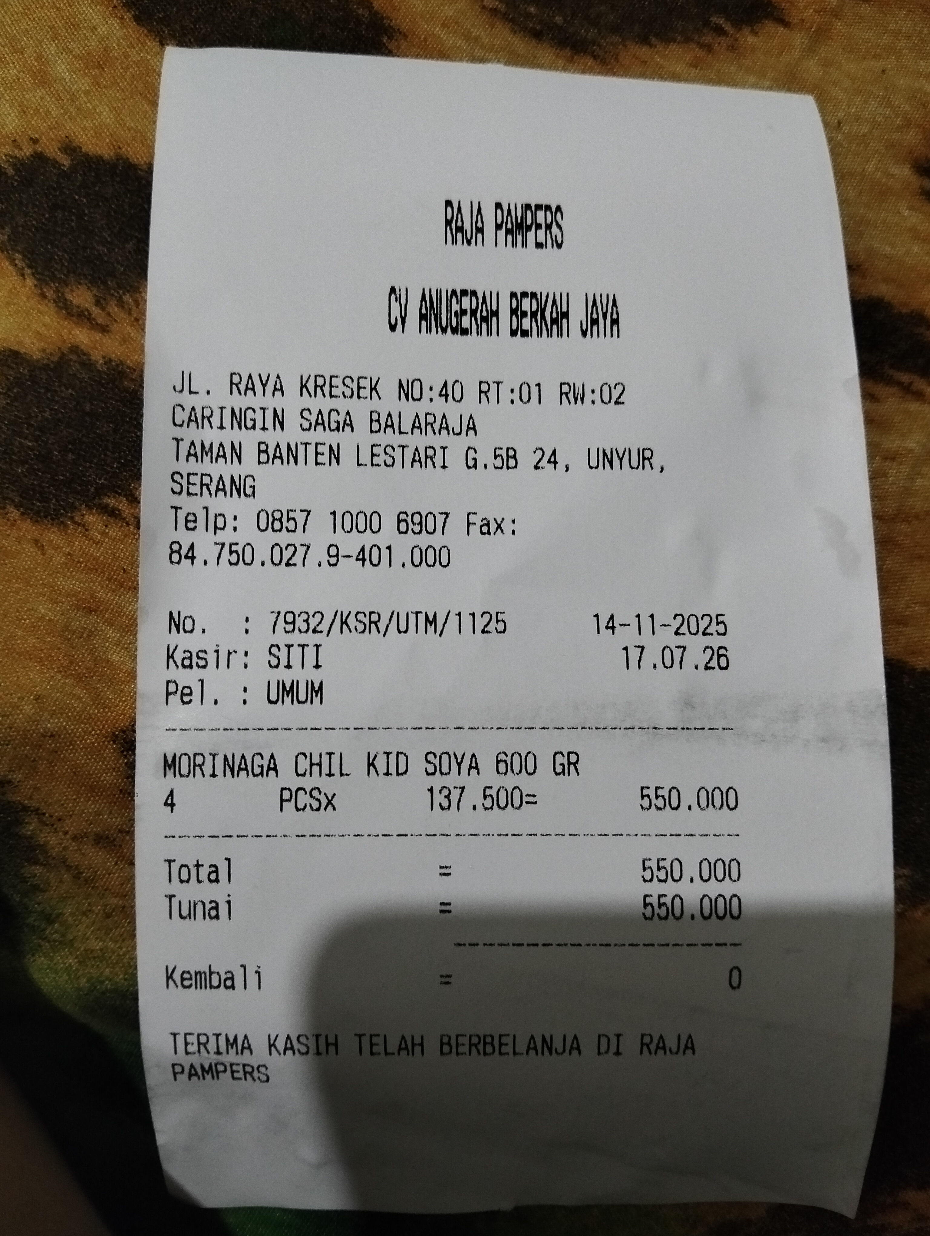 - Susu Morinaga Chil-Kid Soya 4 kotak x Rp137.500 = Rp550.000
