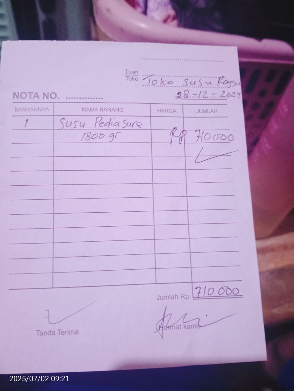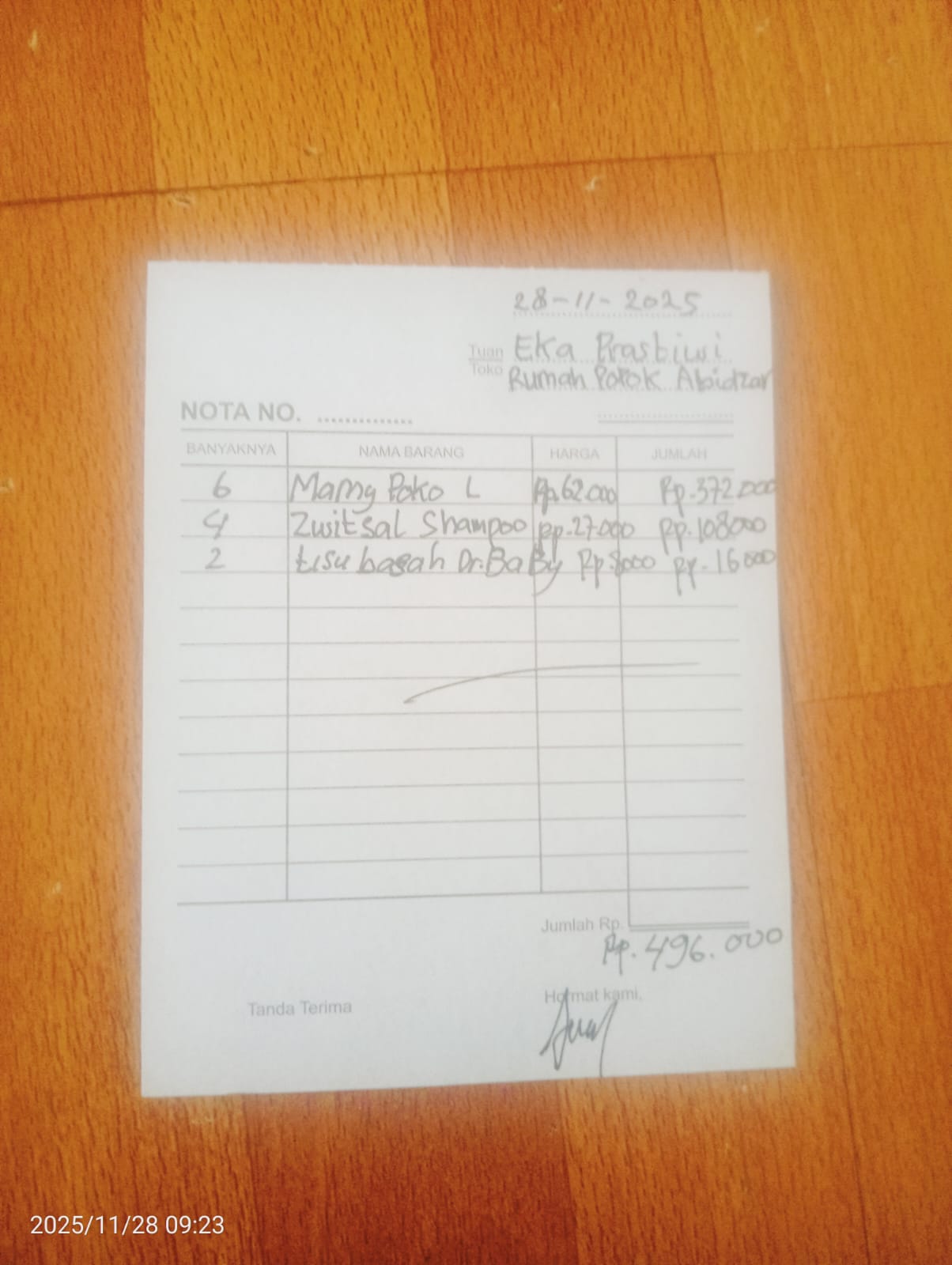 Dana digunakan untuk 1. Pembelian Susu SGM Rp 89.000 x 6 = Rp 534.000 2. Pembelian Pampers Mamy Poko L Rp 60.000 x 6 = Rp 360.000 3. Pembelian Shampo Bayi Rp 25.000 x 2 =100.000 4. Pembelian Tissue Basah Rp 17.0002025-11-18 10:26:45