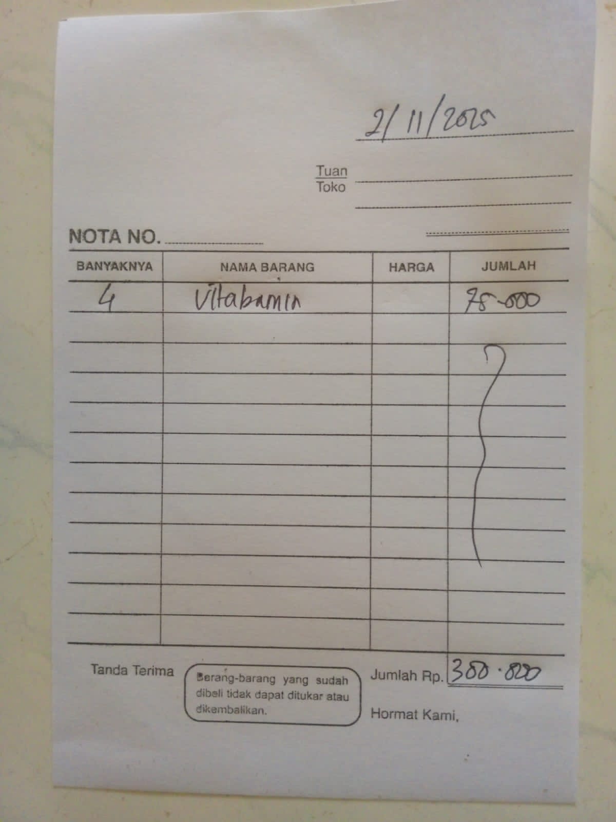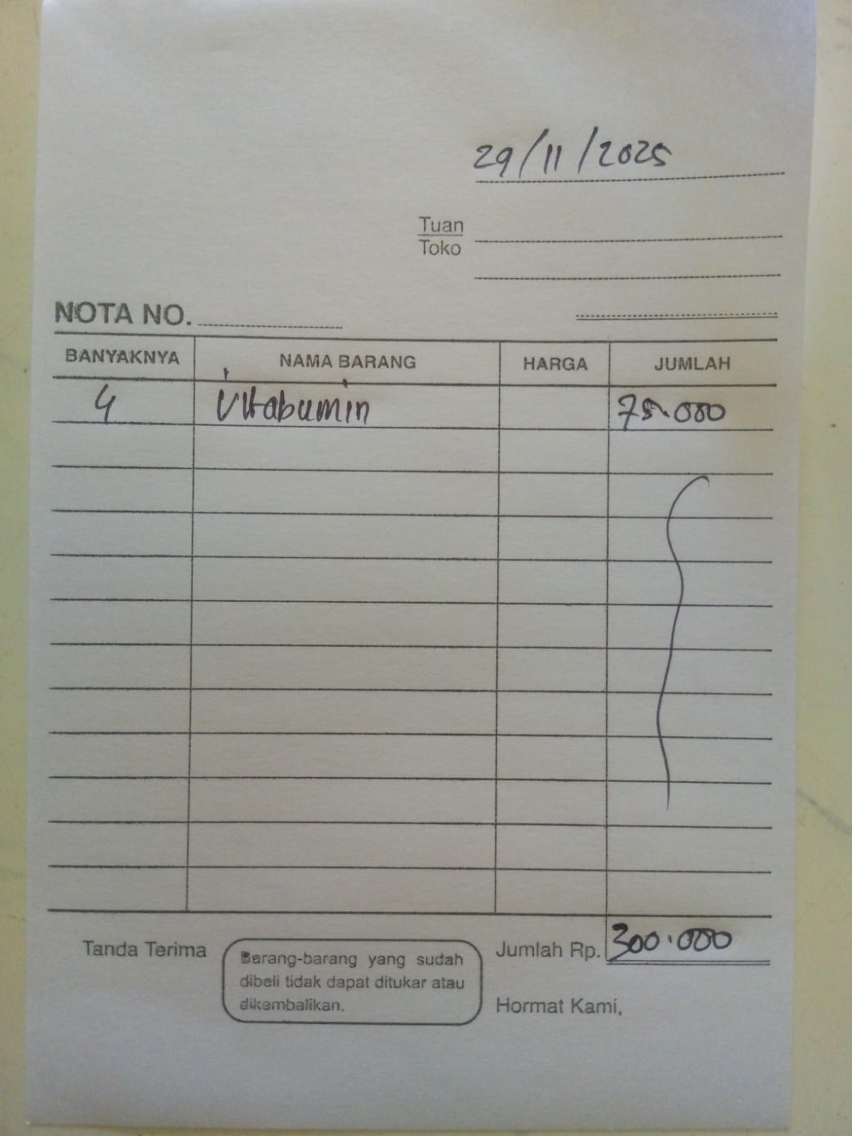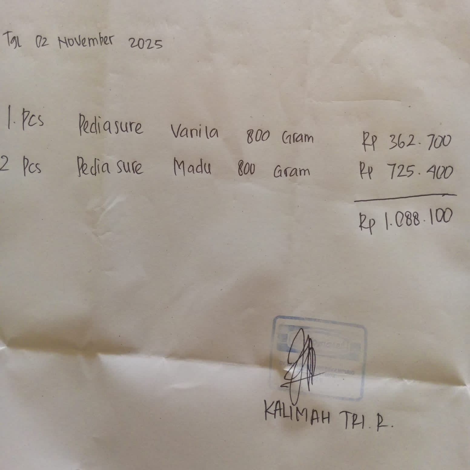 Dana digunakan untuk 1. Susu pedia sure Rp360.000×3= Rp1.080.000 2. Susu frisian flag Rp84.000×2 = Rp168.000 3. Susu milo Rp86.000 × 2 = Rp172.000 3. Vitabumin Rp75.000 × 4= Rp300.0002025-11-03 11:20:50