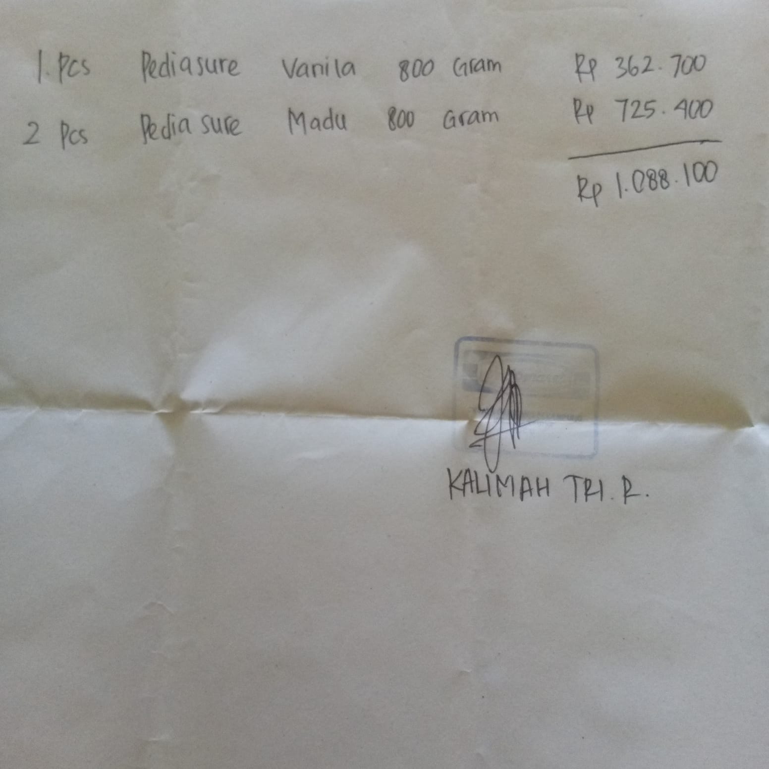Dana digunakan untuk 1. Susu pedia sure 800gr Rp362.000 × 3 = Rp1.086.000 2. Susu frisian flag 750gr Rp84.000× 2 = Rp168.000 3. Susu milo 750gr Rp86.000 × 2 = Rp172.000 4. Vitabumin Rp75.000× 4 = Rp300.000 5. Transportasi kontrol ke RS Rp50.0002025-11-26 10:01:43