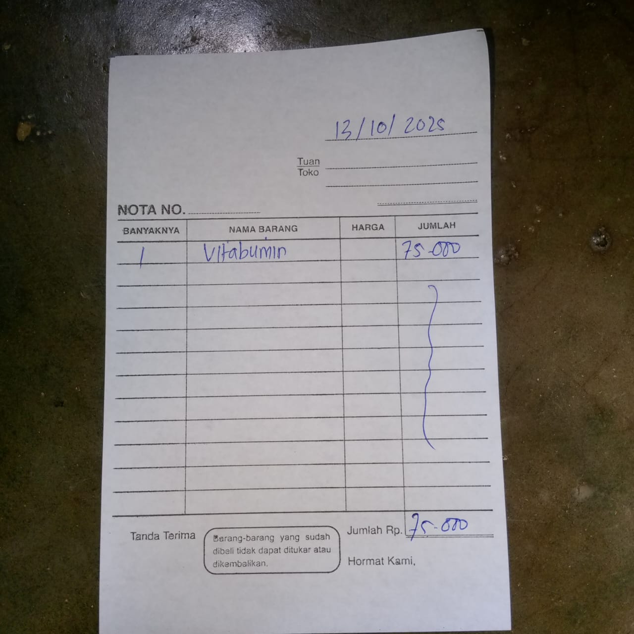 Dana digunakan untuk 1. Susu frisian flag 800gr Rp84.000 x 2 dus = Rp168.000 2. Susu dancow 780gr Rp93.000 3. Vitabumin Rp75.000 x 2 botol =Rp150.0002025-10-13 09:12:21