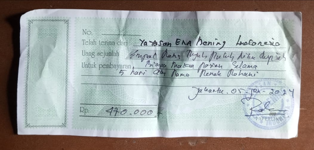 Dana digunakan untuk bantuan biaya kos Nenek Rohani yang tinggal sebatang kara Sewa kos 900.000 1 bulan2024-07-09 09:44:33