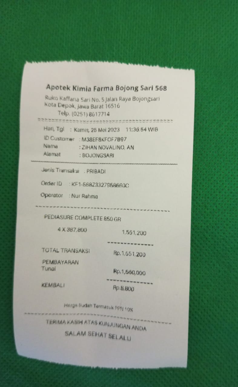 Dana digunakan untuk pembelian Susu Pediasure Completed 850 gram 4 kaleng Rp1.551.200.2023-05-23 16:26:46
