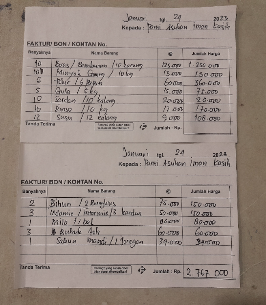 Dana digunakan untuk 1. Beras 100 kg Rp1.250.000 2. Bimoli 10 kg Rp130.000 3. Telur 6 papan Rp360.000 4. Gula 5 kg Rp75.000 5. Sarden 10 kaleng Rp200.000 6. Rinso 10kg Rp170.000 7. Susu 6 kaleng Rp108.000 8. Bihun 2 bungkus Rp150.000 9. Indomie 3 kardus Rp150.000 10. Milo 1 ball Rp80.000 11. Bubuk teh 3 bungkus Rp60.000 12. Sabun mandi Rp34.000.2023-01-24 16:24:46