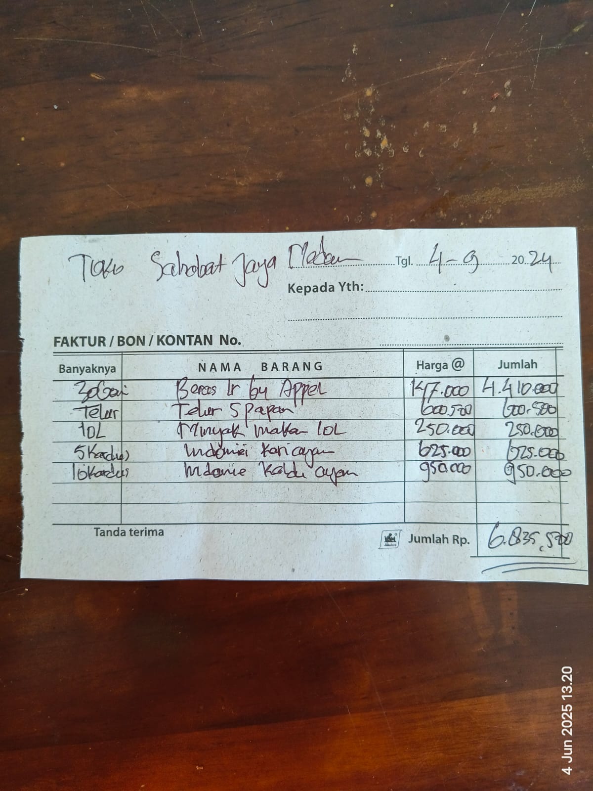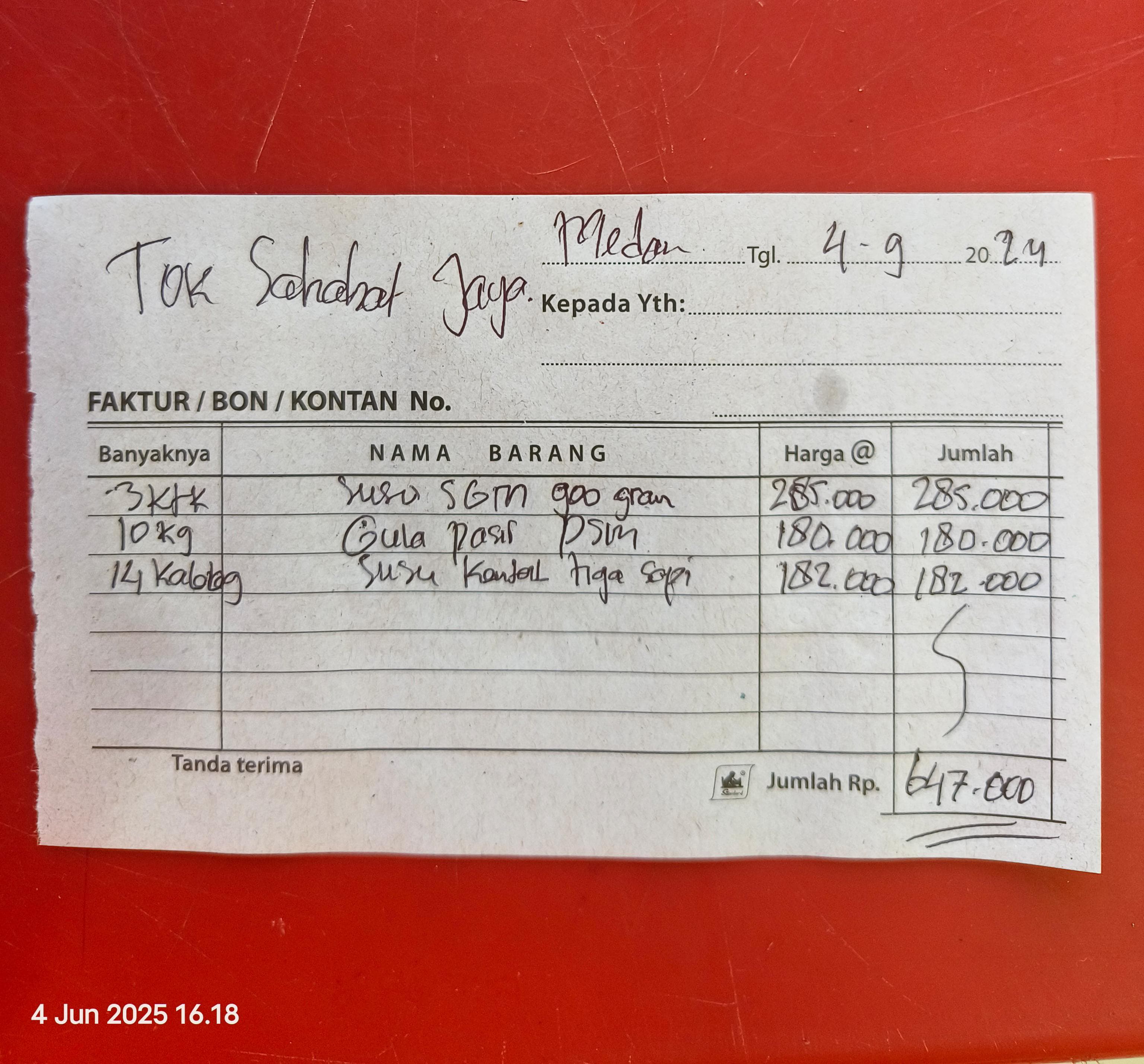 Dana digunakan untuk 1. Beras Rp169.000 x 40goni= Rp6.760.000 2. Susu Rp13.000 x 48 kaleng = Rp624.000 3. Sardine Rp28.500 x 39pcs = Rp1.111.500 4. Telur Rp1800 x 306 butir = Rp550.800 5. Minyak Goreng Rp38.000x 25pcs = Rp950.000 6. Kacang hijau Rp30.000 x 10kg= Rp300.000 7. Gula pasir Rp18.000 x 20 kg= Rp360.000 8. Sabun cuci Rp56.000 x 3 dus = Rp168.0002025-07-29 10:42:52