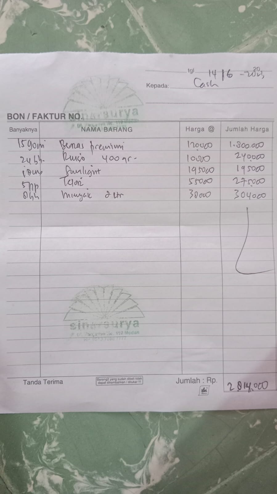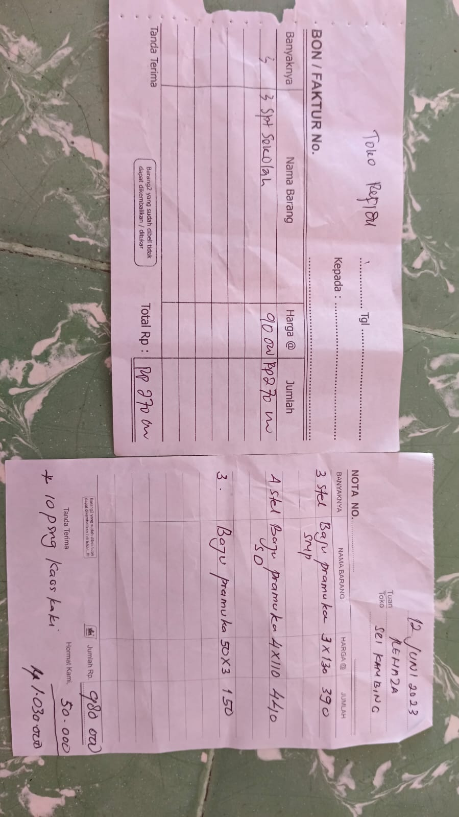 Dana digunakan untuk 1. Pembayaran tagihan uang sekolah anak-anak panti Rp4.440.000 2. Pembelian baju pramuka 115.000 x 6 set= Rp690.000 3. Sepatu sekolah 110.000 x 4 pasang= Rp440.000 2. Biaya listrik Rp400.000 3. Beras 150 kg Rp1.815.000 4. Deterjen Daia 1,7 kg Rp370.000 5. Sunlight 10 liter Rp270.000 6. Minyak goreng 25 liter Rp430.000 7. Pembelian sayur-sayuran dan air mineral galon untuk 1 bulan Rp1.305.339 8. Biaya air PDAM Rp195.000.2023-06-09 16:34:26
